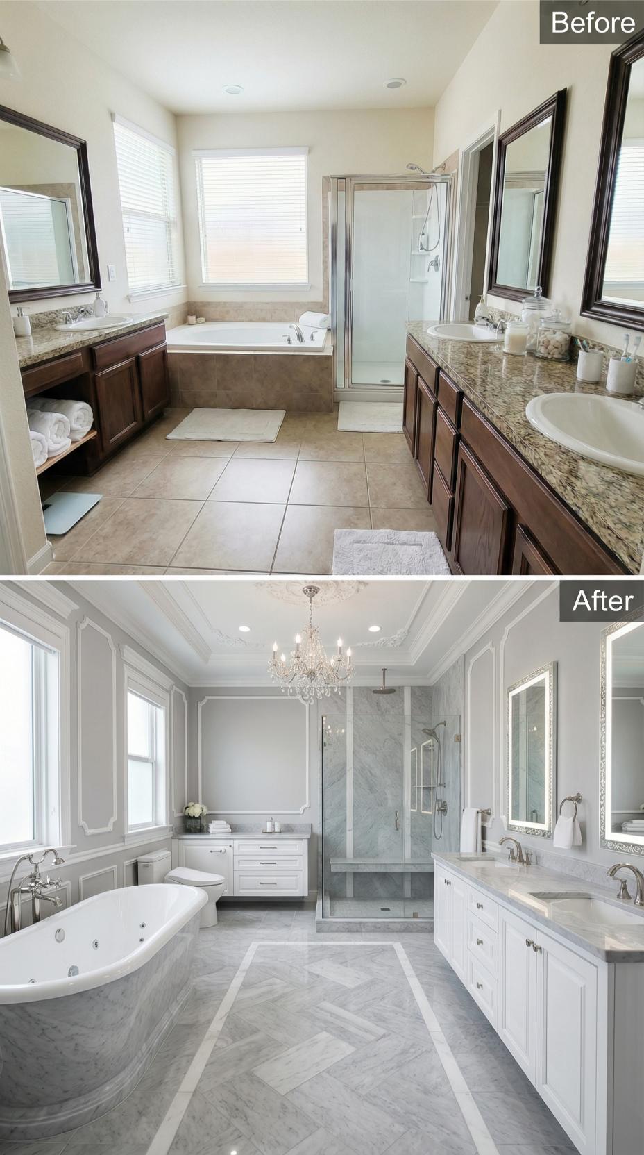 Elegant white cabinetry and sophisticated gray marble flooring completely transformed this builder-grade primary bathroom into a spa-worthy retreat. The renovation replaced basic brown vanities with custom white millwork, added a stunning crystal chandelier, and introduced a freestanding soaking tub. Clean lines, premium materials, and abundant natural light create an upscale sanctuary that eliminates every trace of the original cookie-cutter design.
