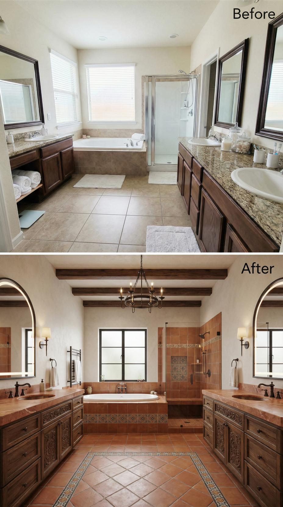 Warm terracotta tiles and hand-carved wooden vanities completely transformed this sterile builder-grade primary bathroom into a Mediterranean-inspired retreat. Exposed wooden ceiling beams and wrought-iron chandeliers replaced the flat ceiling, while arched doorways and decorative tile borders eliminated the cold, clinical atmosphere. Rich copper vessel sinks and textured stone surfaces create an organic, spa-like environment that’s both luxurious and naturally antimicrobial.