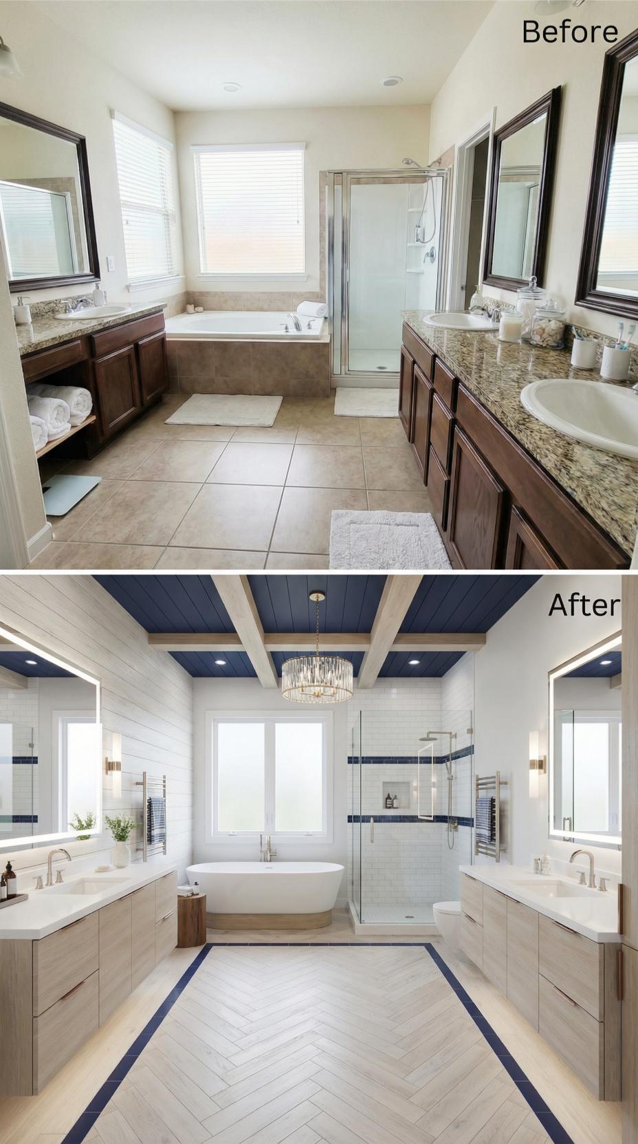 Dark wood vanities transform from builder-grade basics into sophisticated floating consoles with clean white countertops. The cramped corner shower expands into a luxurious glass-enclosed wet room, while dramatic navy ceiling beams and a statement crystal chandelier replace bland contractor finishes. Herringbone flooring with navy accents creates visual interest, and dual vanity mirrors frame the space with hotel-like elegance perfect for health-conscious homeowners.