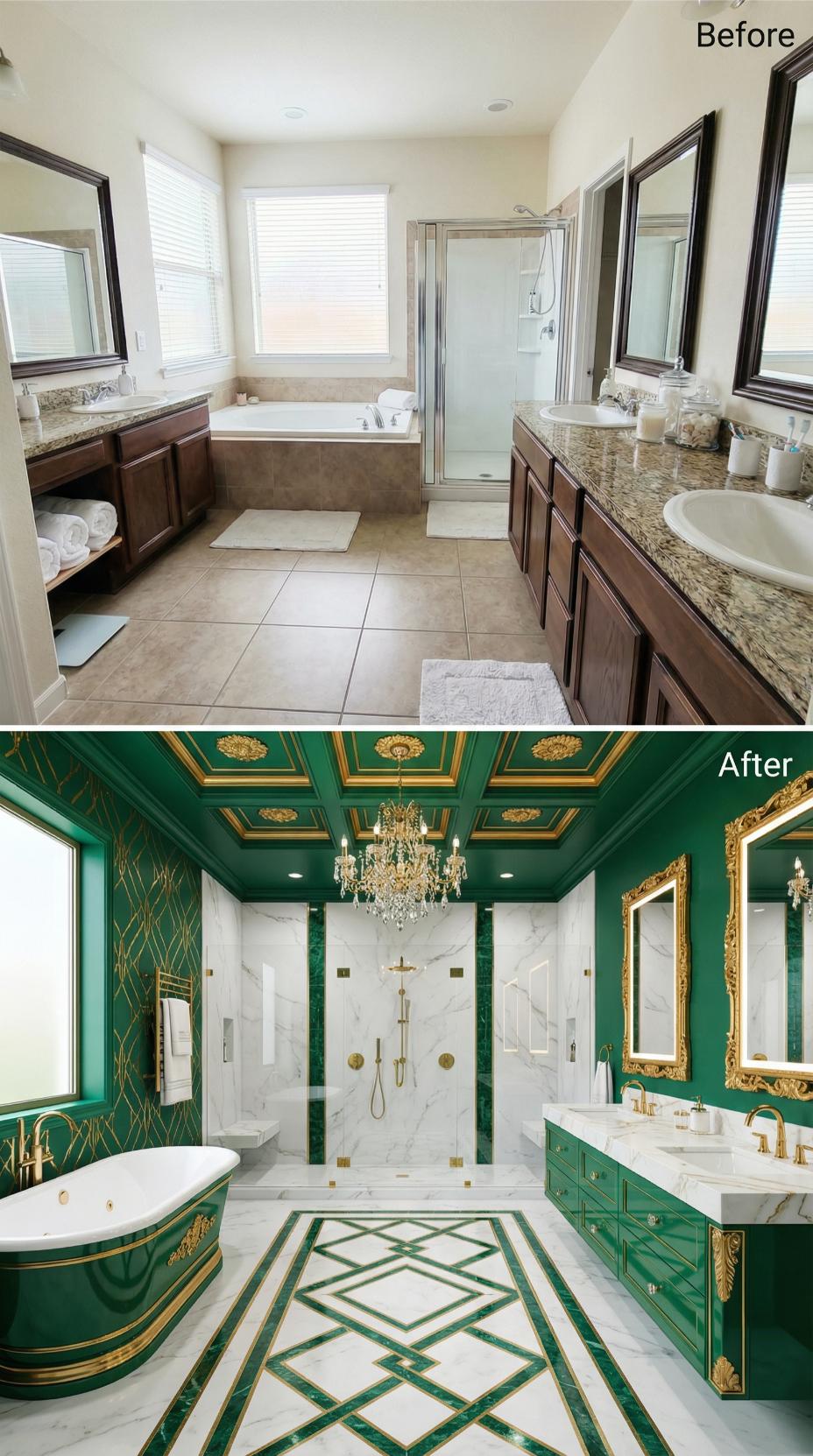 Luxurious emerald green walls and an ornate coffered ceiling transform this builder-grade primary bathroom into a regal sanctuary. White marble surfaces with dramatic veining replace granite countertops, while gold fixtures and ornamental details elevate the space. A crystal chandelier crowns the room, complementing gilded mirrors and creating an opulent atmosphere. The geometric marble floor pattern adds sophisticated visual interest to this palatial retreat.