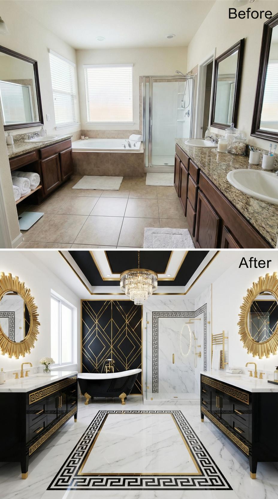 Luxurious black and gold finishes elevate this builder-grade primary bathroom for germophobes into a sophisticated Art Deco masterpiece. Greek key patterns cascade across custom cabinetry and flooring while geometric wallpaper creates dramatic focal points behind the freestanding tub. Crystal chandeliers and sunburst mirrors add glamorous lighting, transforming mundane brown vanities into statement pieces worthy of a luxury hotel suite.
