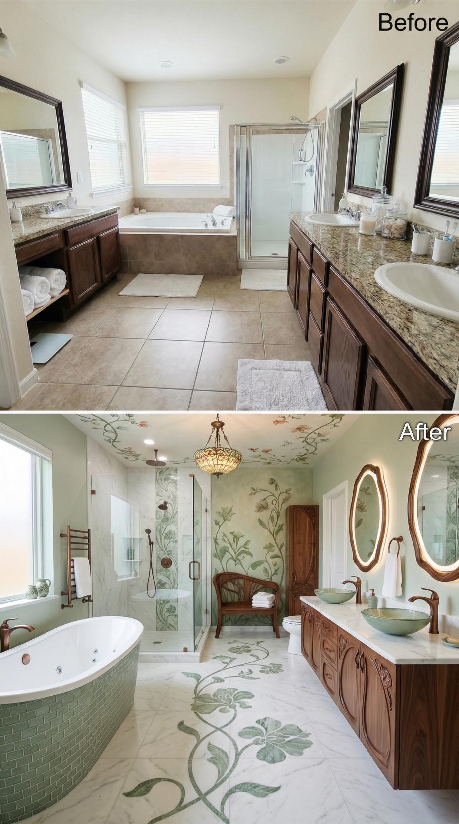 Rich walnut cabinetry replaces the builder-grade brown vanities while intricate botanical wallpaper transforms plain beige walls into an enchanting garden retreat. Vessel sinks in soft green complement the nature-inspired theme, while custom inlay flooring featuring flowing leaf patterns elevates the space from standard tile work. Warm brass fixtures and an elegant crystal chandelier add luxurious touches that completely reimagine this primary bathroom’s character.