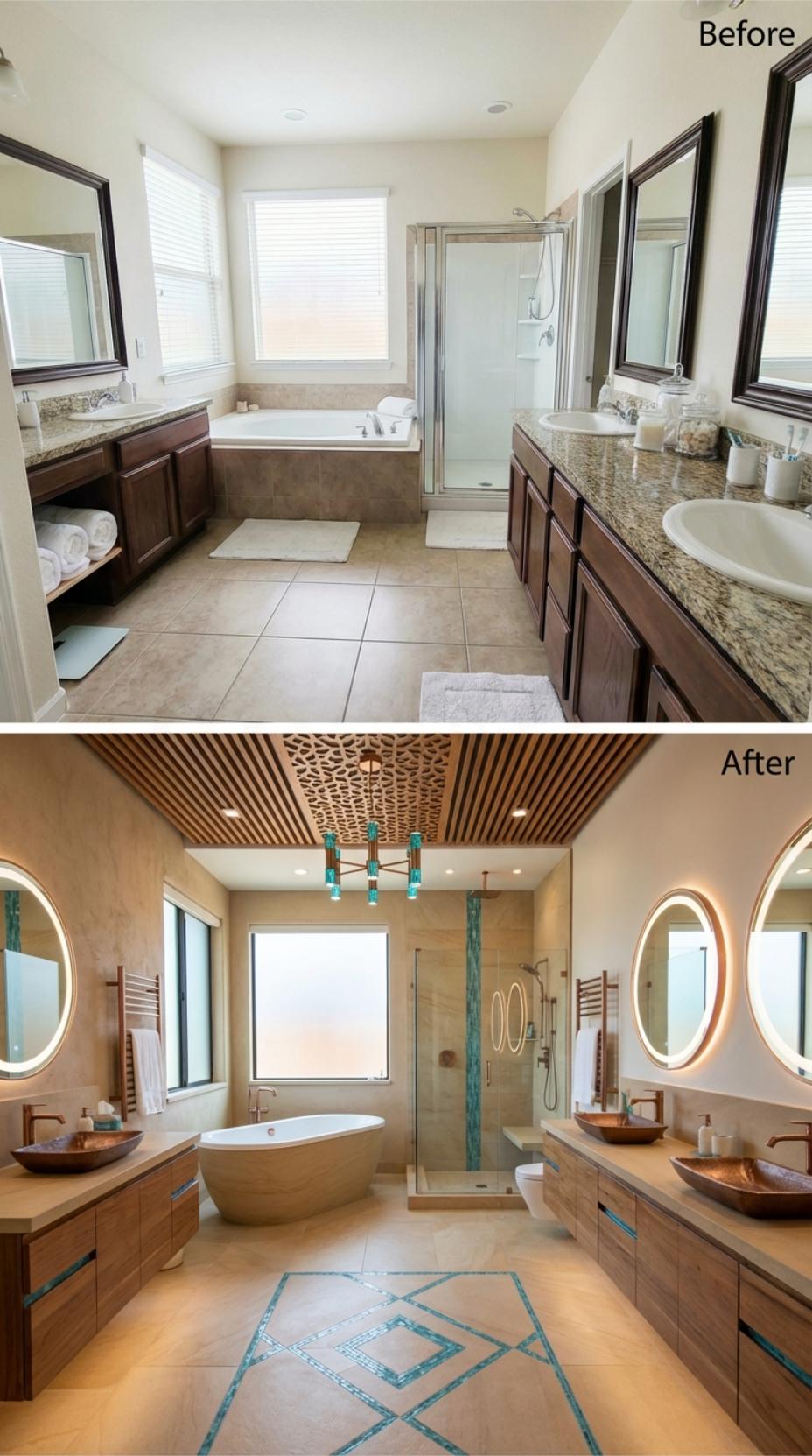 Warm wood tones and copper vessel sinks transform this builder-grade primary bathroom into a luxurious retreat. The renovation replaces standard rectangular mirrors with illuminated circular ones, while a stunning wooden slat ceiling with geometric cutouts adds architectural drama. Turquoise accent tiles create striking vertical lines in the shower, complementing the geometric floor pattern that anchors the entire spa-like design.