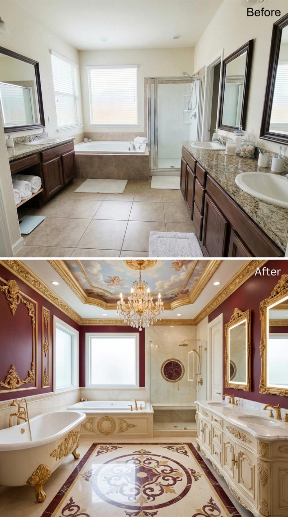 Burgundy walls adorned with ornate gold molding transform this mundane builder-grade primary bathroom into a palatial retreat. Crystal chandeliers illuminate elaborate ceiling murals while an ornamental clawfoot tub replaces the standard corner installation. Marble countertops with intricate carved details and gold fixtures elevate the space from sterile functionality to regal sophistication, creating an indulgent sanctuary.