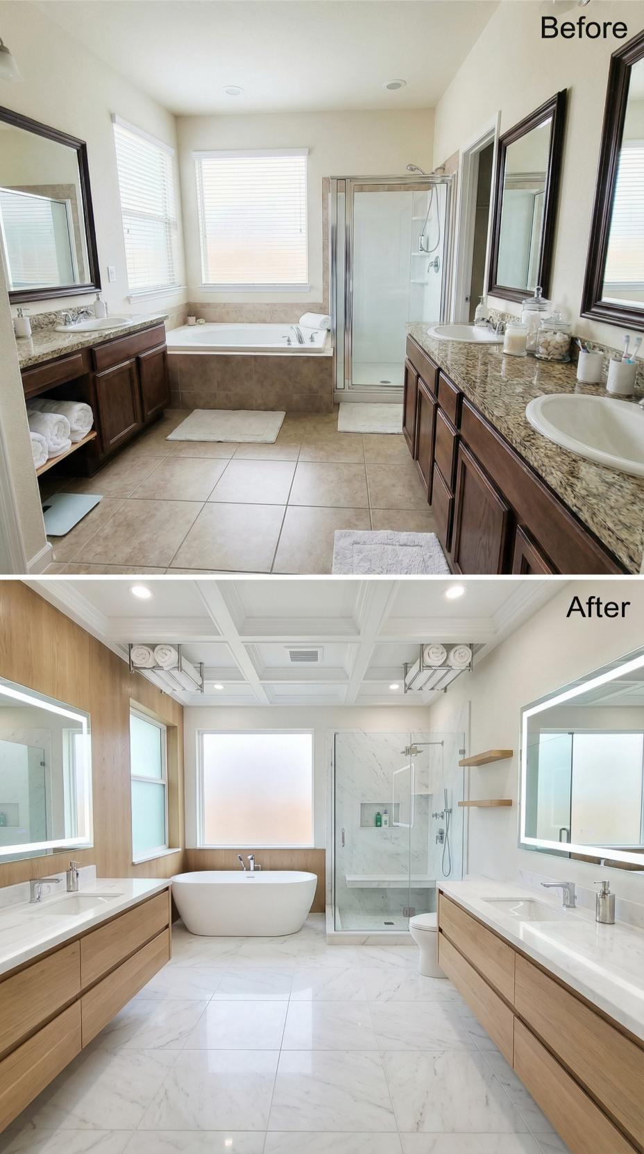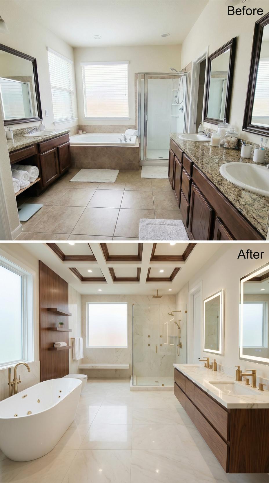 Rich walnut cabinetry and a stunning coffered ceiling elevate this renovation from basic builder-grade functionality to resort-worthy luxury. The original cramped layout gives way to an open floor plan featuring a sculptural freestanding tub, expansive walk-in shower, and floating double vanity. Warm brass fixtures complement the wood tones, while pristine white countertops and strategic lighting create an ultra-clean aesthetic perfect for those prioritizing hygiene and wellness.