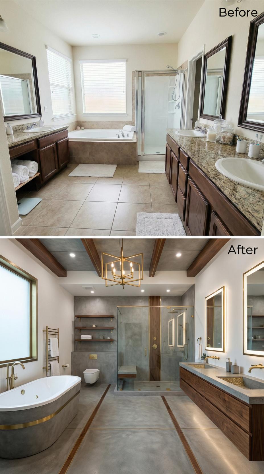 Exposed black ceiling beams and copper accents transform this mundane builder-grade primary bathroom into an industrial spa retreat. The renovation eliminates granite countertops and traditional cabinetry, introducing a striking copper soaking tub, vessel sinks, and open vanity storage. Concrete-look tiles replace standard flooring while copper pendant lights and plumbing fixtures create cohesive metallic warmth throughout the sophisticated space.
