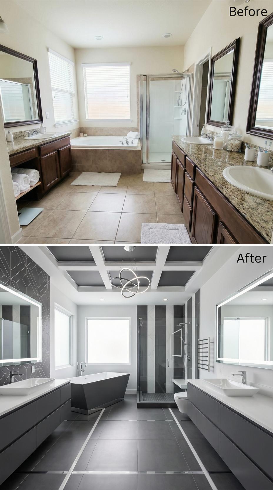 Dark charcoal cabinetry and geometric wallpaper transform this builder-grade primary bathroom into a sophisticated retreat. The renovation replaces warm beige tones with cool grays, introduces a dramatic coffered ceiling with modern chandelier, and swaps the corner shower for a spacious glass enclosure. Floating vanities create visual lightness while maintaining dual sinks, and the freestanding tub becomes a striking focal point against the window.