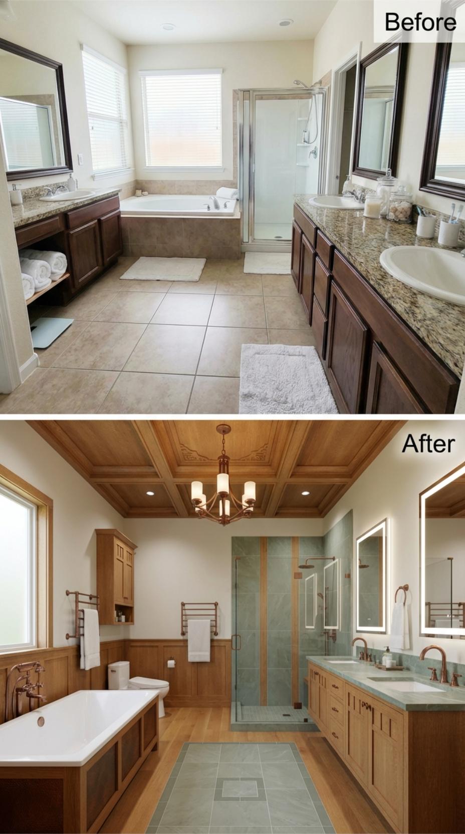 Warm wood cabinetry transforms this once-sterile bathroom into a craftsman masterpiece, while the stunning coffered ceiling adds architectural drama overhead. Rich hardwood floors replace basic tile, creating seamless flow throughout the expansive space. A glass-enclosed shower with subway tile backsplash offers easy maintenance, while dual vanities provide ample counter space for daily routines without crowding.