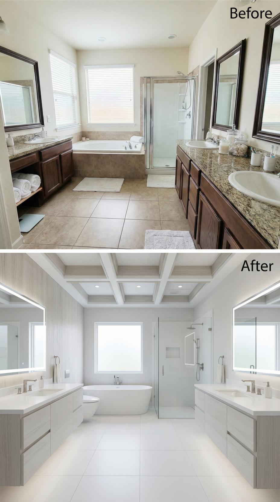Coffered Ceiling Drama Transforms Builder-Grade Primary Bathrooms