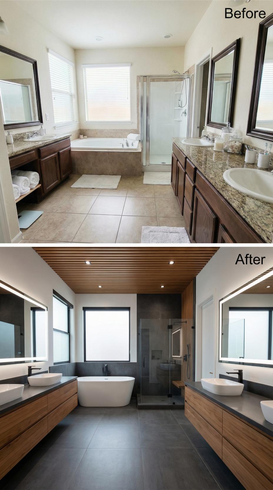 Dark slate floors and rich wood floating vanities transform this builder-grade primary bathroom into a spa-like retreat. The renovation eliminates cramped quarters by removing the old tub surround, replacing it with a sleek freestanding soaker and spacious walk-in shower. Vessel sinks, black fixtures, and a stunning wood-slat ceiling create sophisticated contrast while maximizing the hygienic appeal germophobes crave.