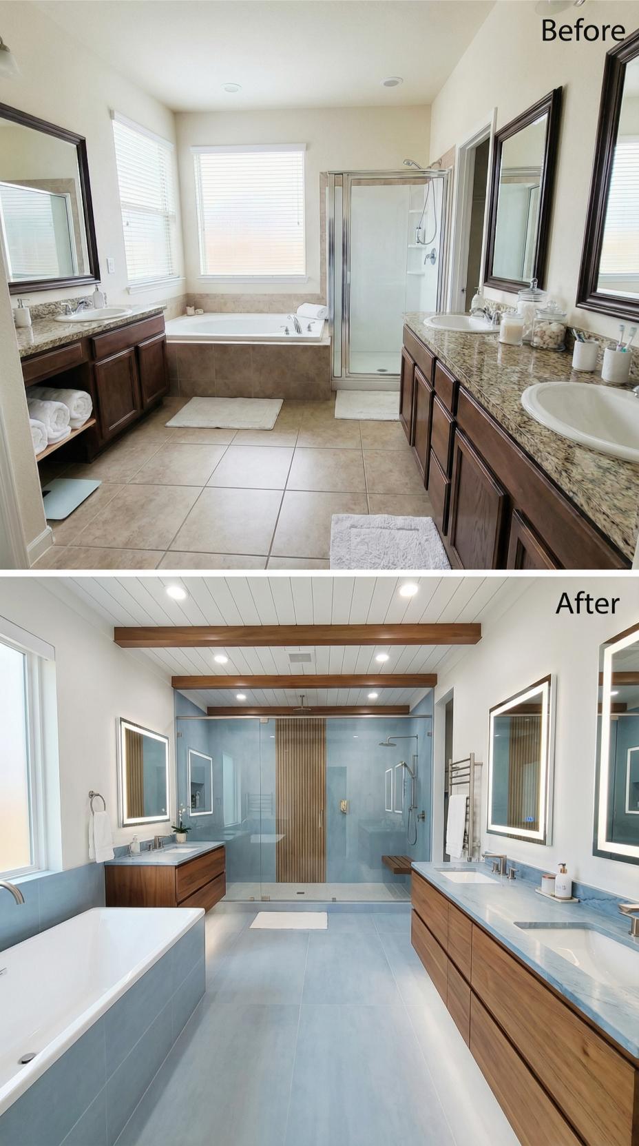 Warm walnut vanities and exposed ceiling beams transform this builder-grade primary bathroom into a serene retreat. The renovation replaces cramped separate vanities with sleek floating cabinets, while a dramatic glass-enclosed shower features vertical wood slats for natural texture. Cool blue-gray tiles throughout create a calming palette that feels infinitely more sophisticated than the original granite and beige scheme.