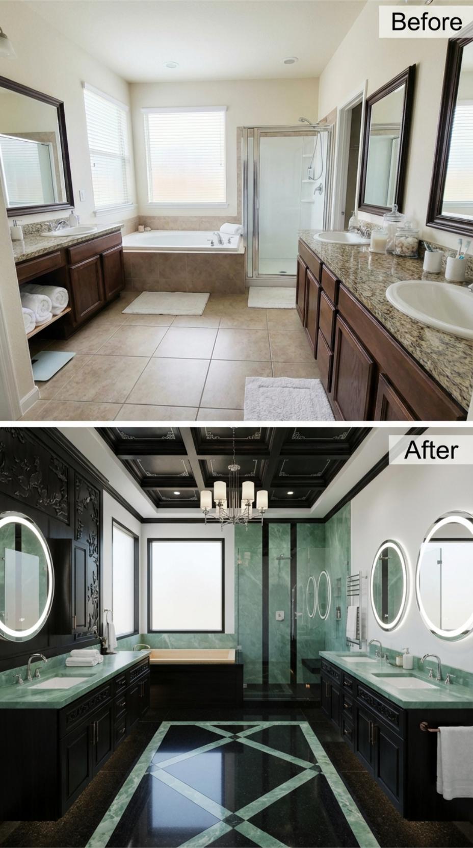 Rich emerald marble transforms this builder-grade primary bathroom for germophobes into a sophisticated sanctuary. Dark wood vanities gain ornate detailing and coffered ceiling treatment, while round backlit mirrors replace basic rectangular ones. The geometric marble floor pattern creates visual drama, and sleek glass shower enclosures with premium green stone surround the space in antimicrobial luxury that’s both striking and hygienic.