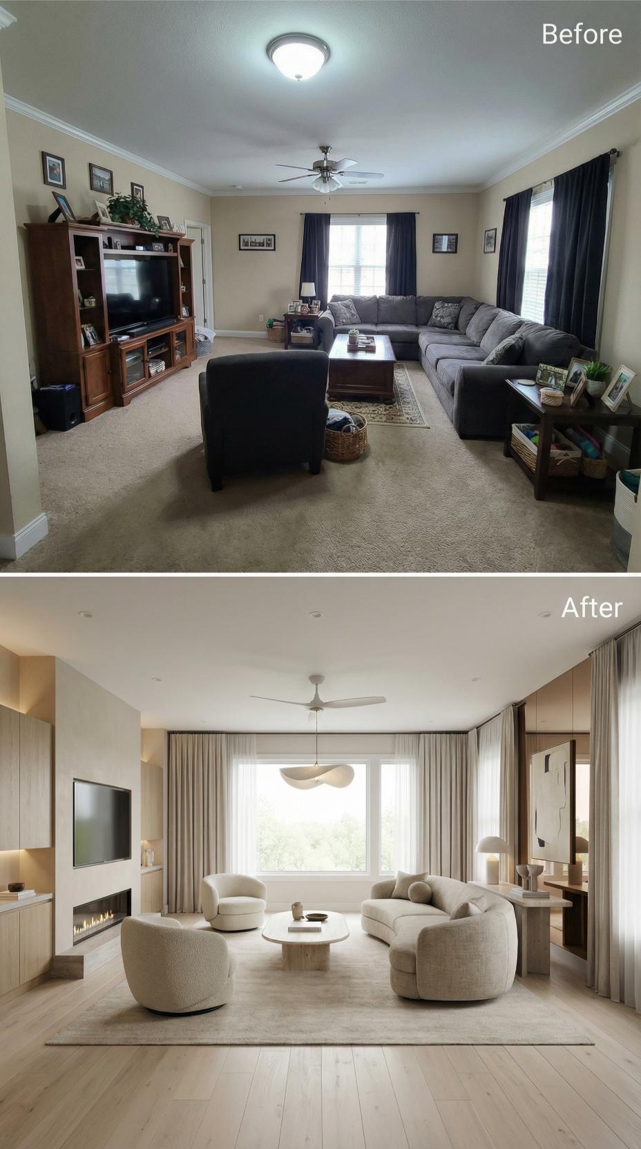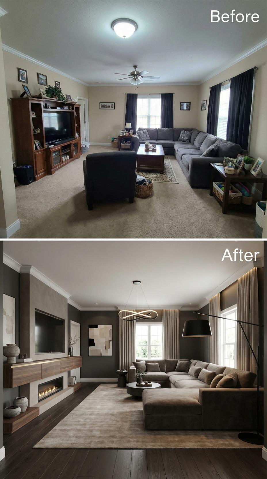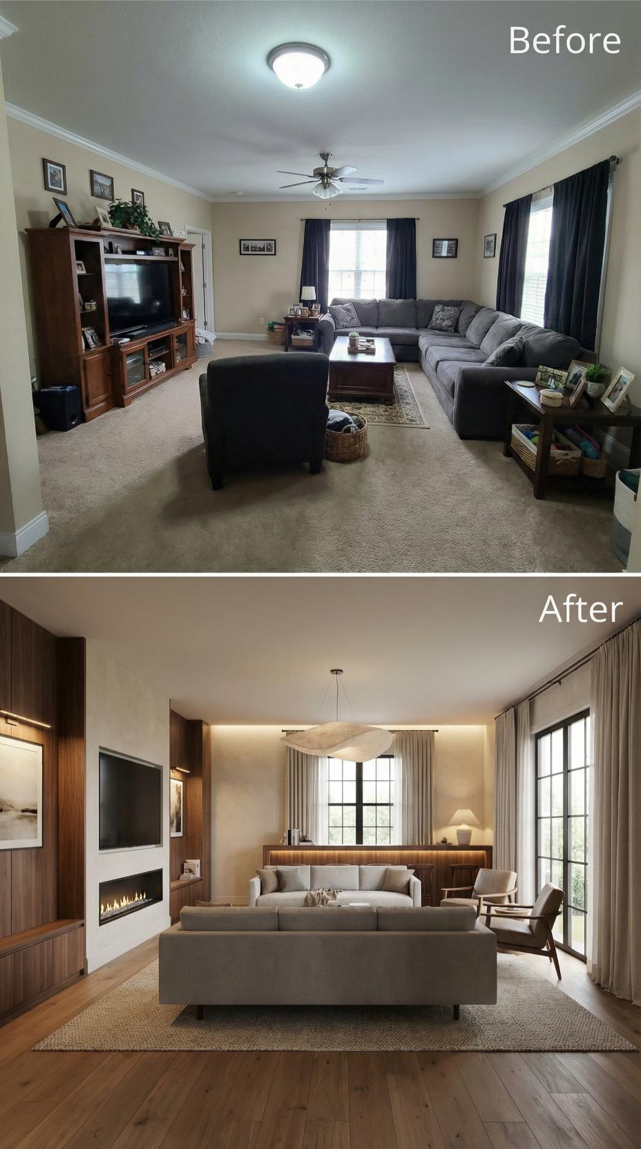 Bold charcoal walls replace beige builder grade finishes, creating instant sophistication in this stunning transformation. The original entertainment center disappears in favor of a sleek linear fireplace with floating walnut media console. Modern recessed lighting and a sculptural infinity pendant elevate the ceiling plane, while rich taupe curtains frame windows with architectural presence. Luxurious materials and thoughtful lighting design transform this once-generic space into a moody, contemporary retreat.