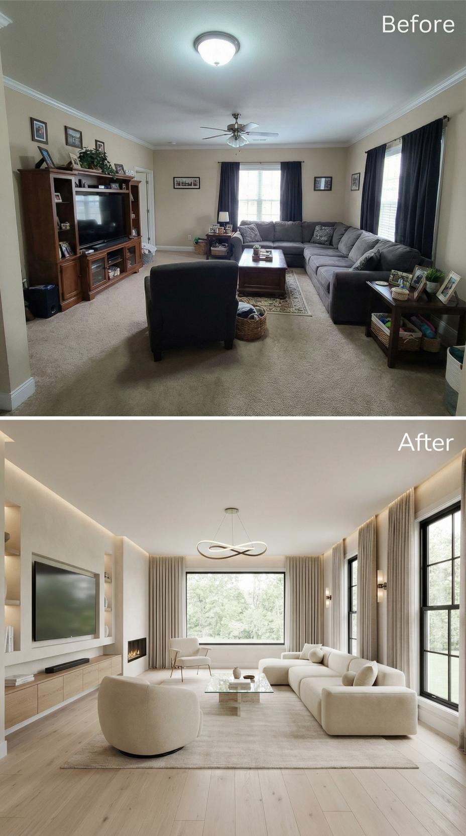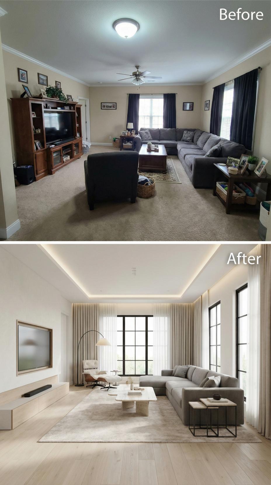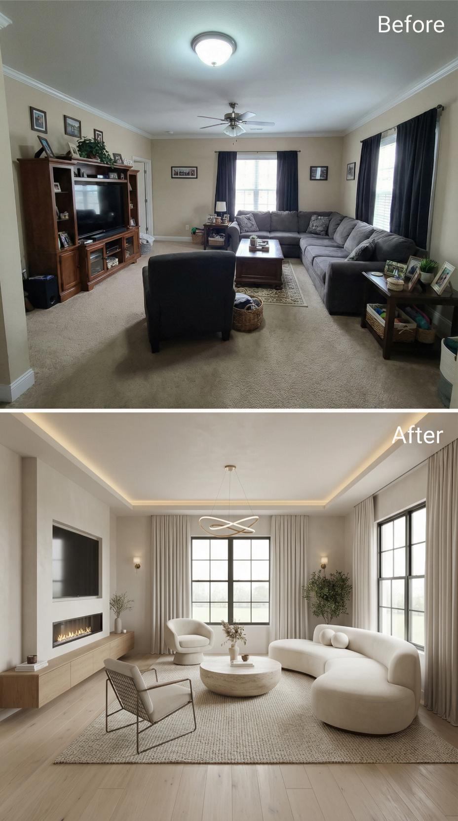 Neutral tones and natural textures transform this builder grade living room into a sophisticated retreat. Built-in entertainment storage replaces bulky furniture while layered lighting creates ambiance through crown molding strips and sculptural pendants. Clean-lined seating and flowing drapery establish an elevated aesthetic that feels both polished and inviting.