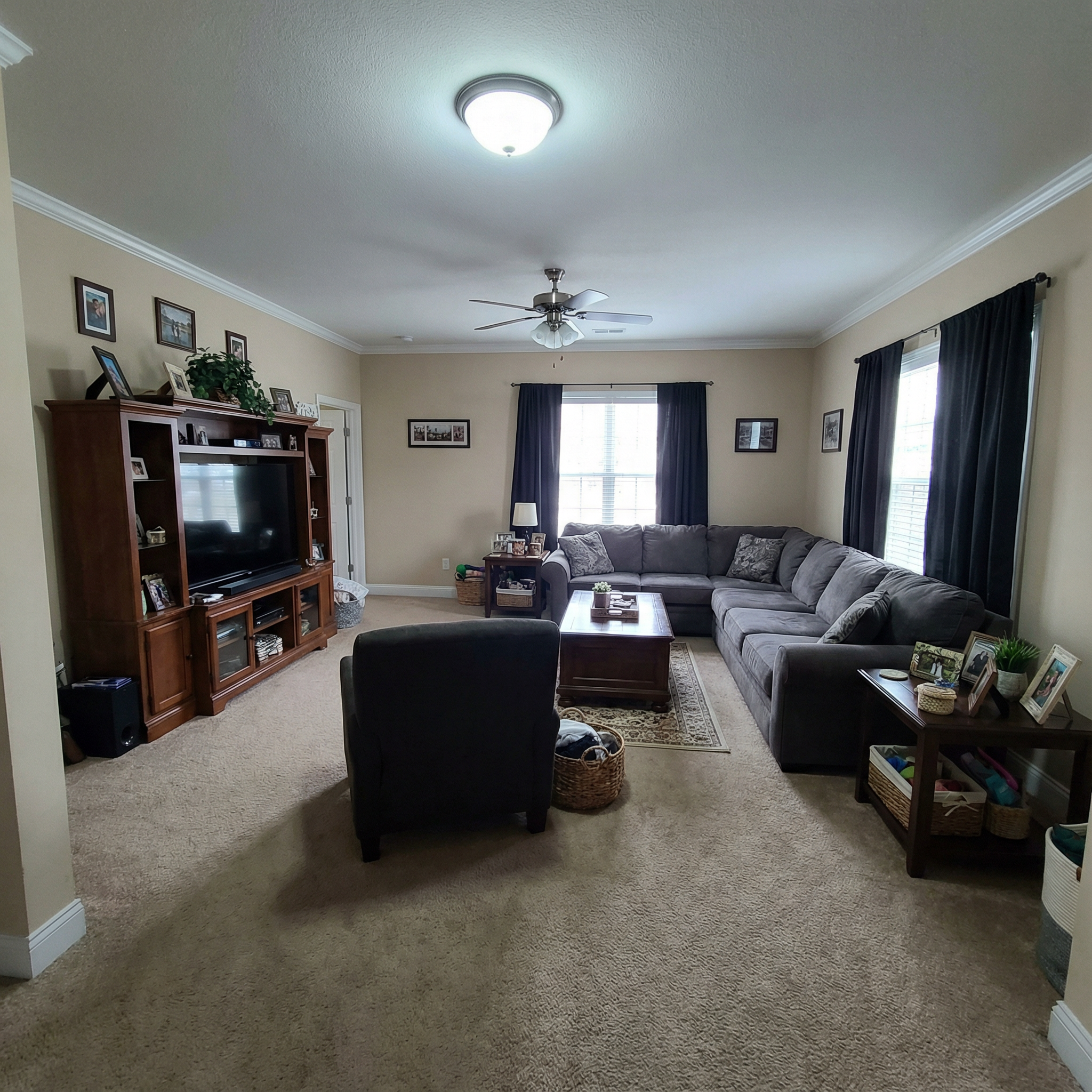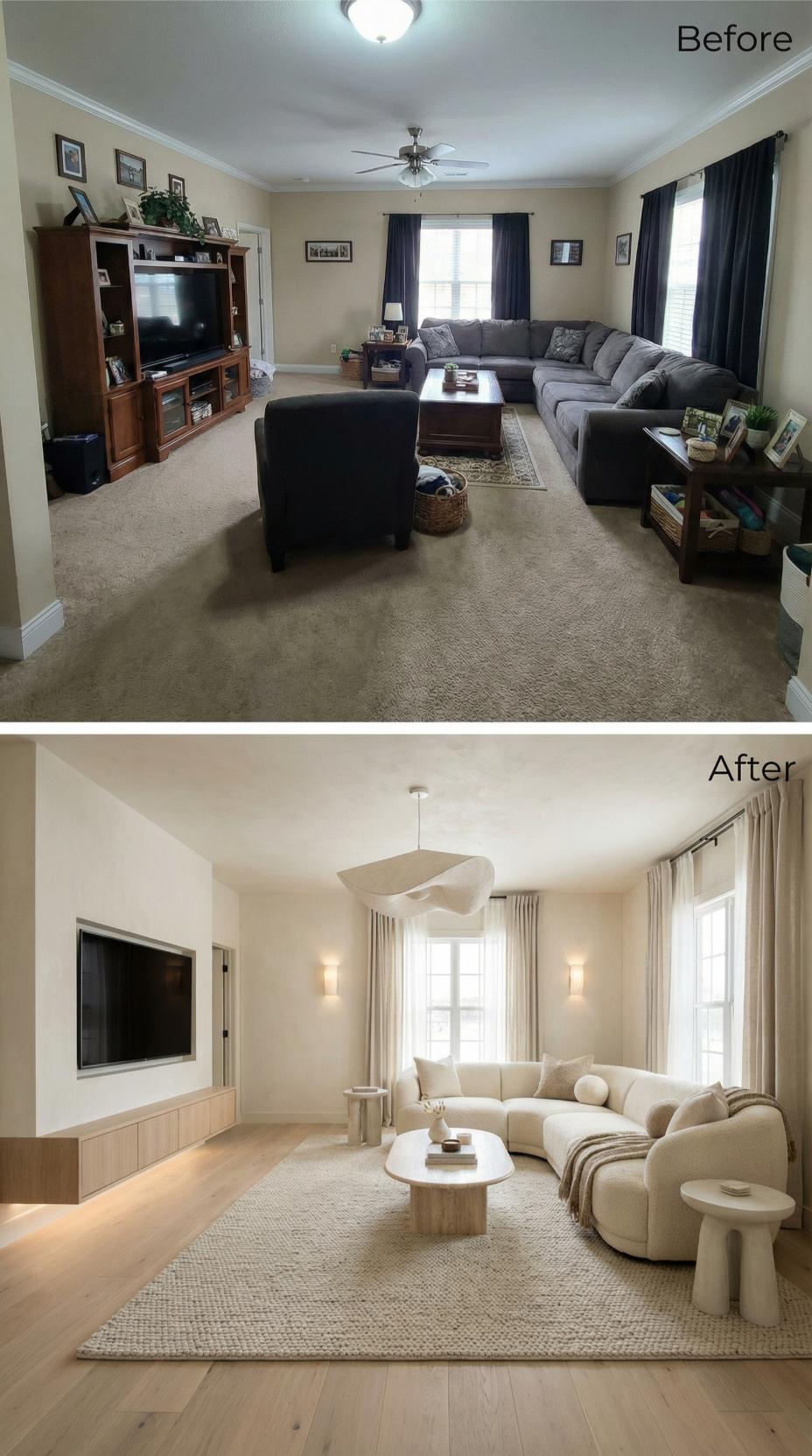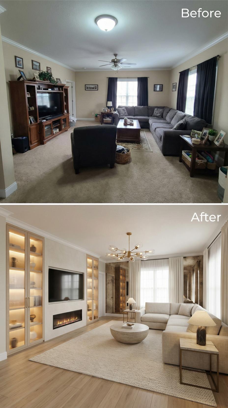 Neutral tones and natural textures transform this builder grade living room into a sophisticated retreat. Built-in entertainment storage replaces bulky furniture while layered lighting creates ambiance through crown molding strips and sculptural pendants. Clean-lined seating and flowing drapery establish an elevated aesthetic that feels both polished and inviting.