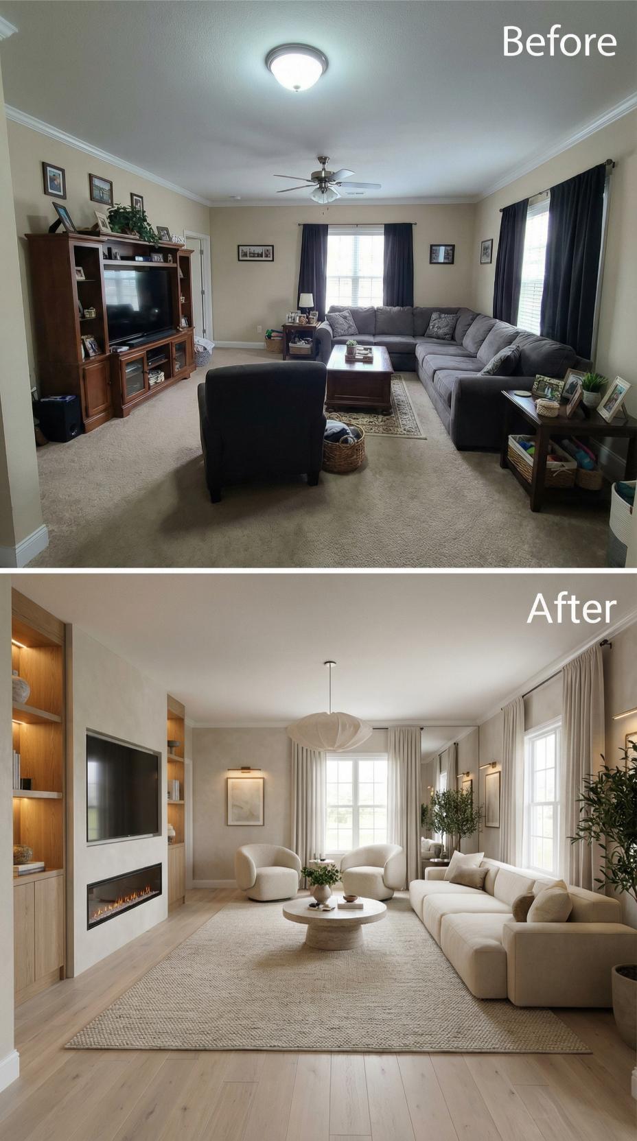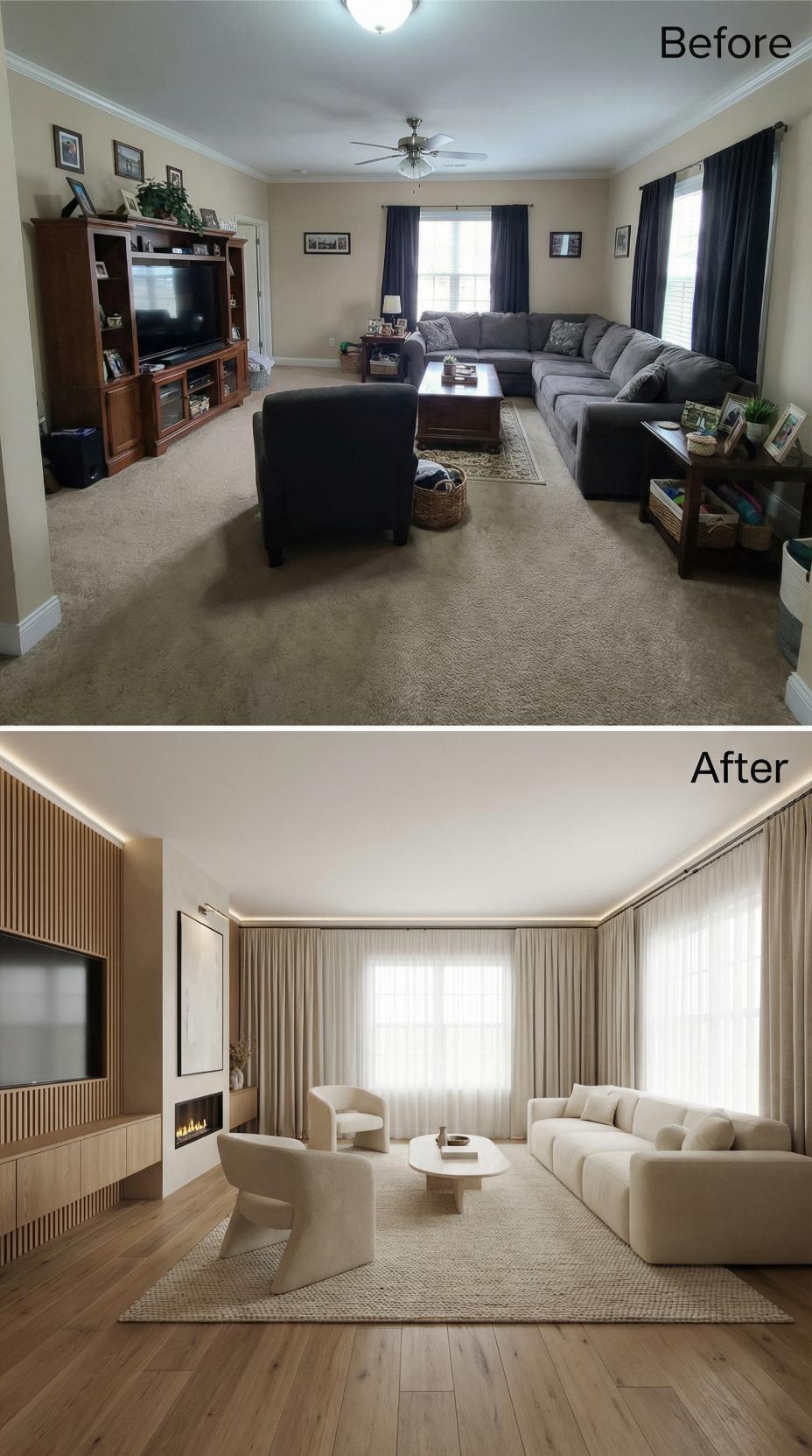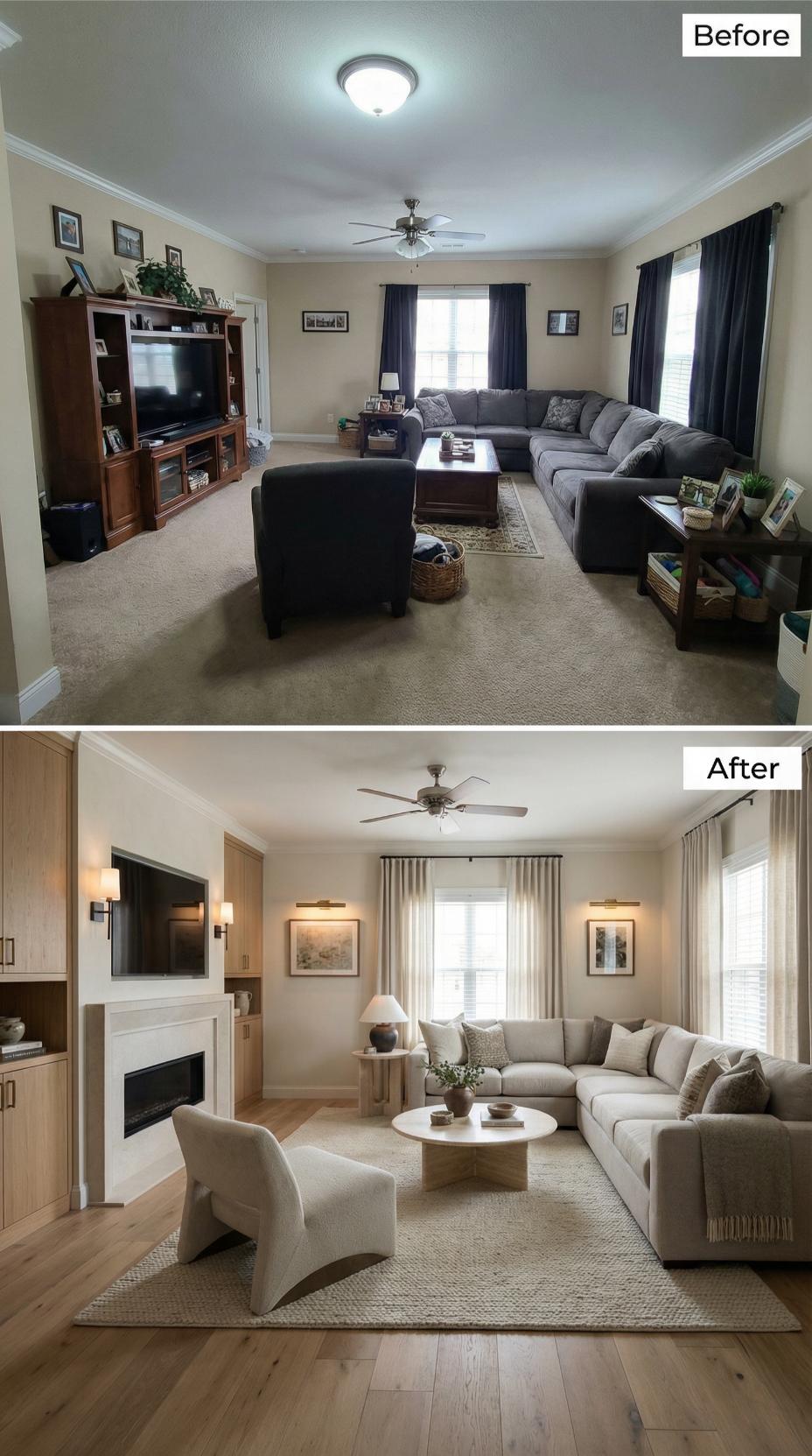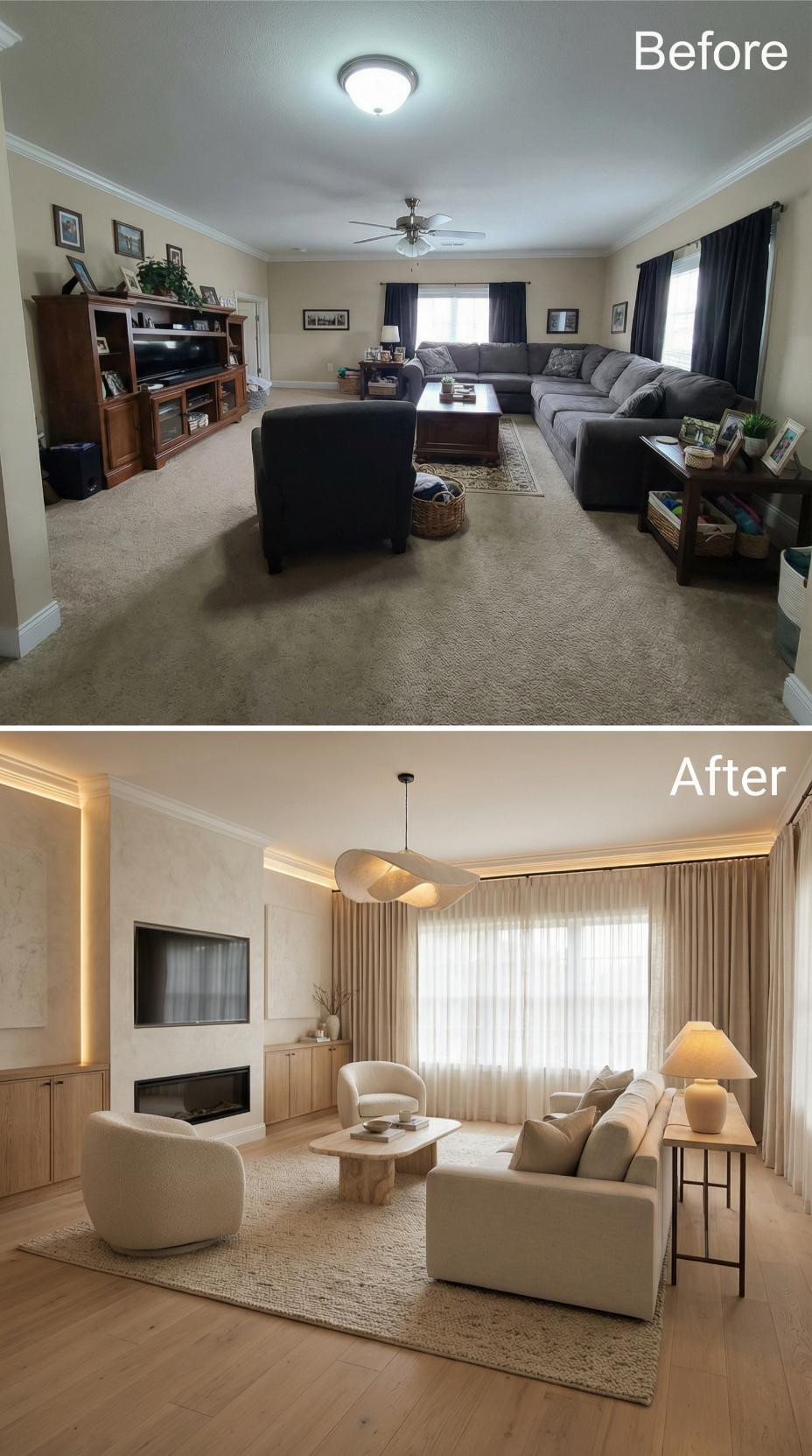 Warm wood flooring and elegant cove lighting replace basic carpet and harsh overhead fixtures in this stunning renovation. Built-in entertainment center with integrated fireplace creates a sleek focal point, while neutral beige sectional seating maintains comfort. Floor-to-ceiling curtains in soft taupe add height and sophistication, transforming the once-generic space into a refined contemporary retreat perfect for relaxation.