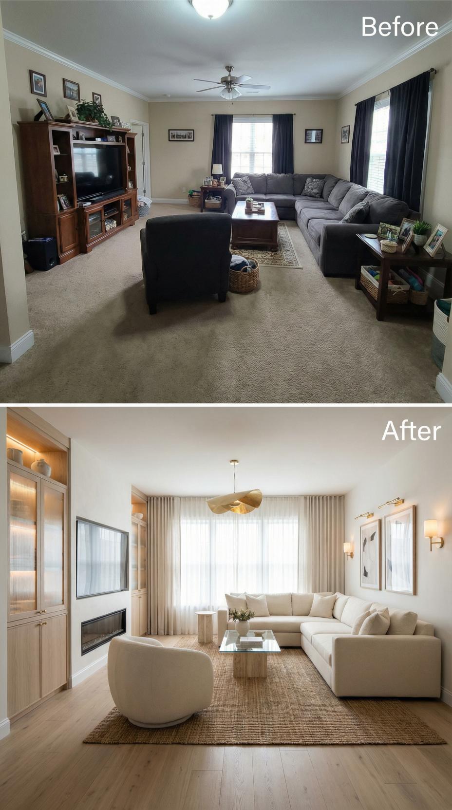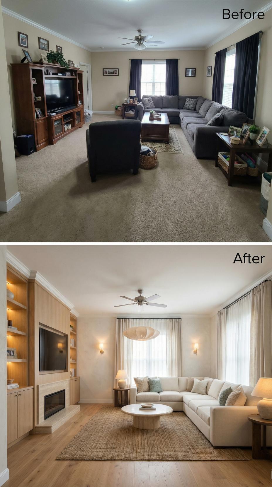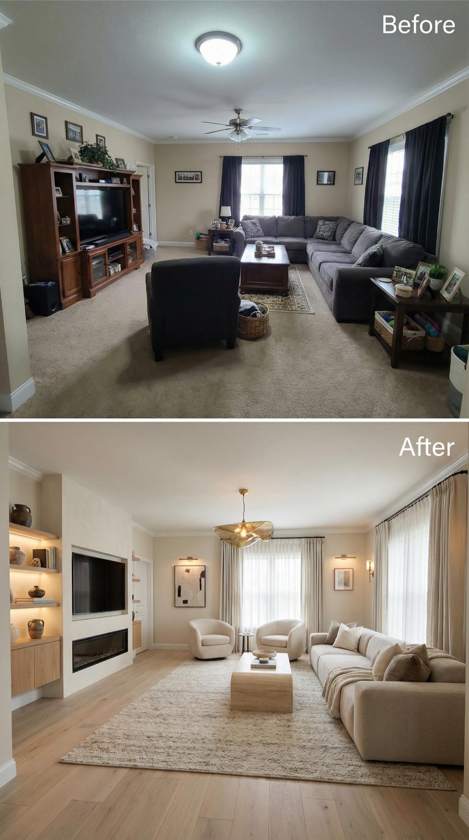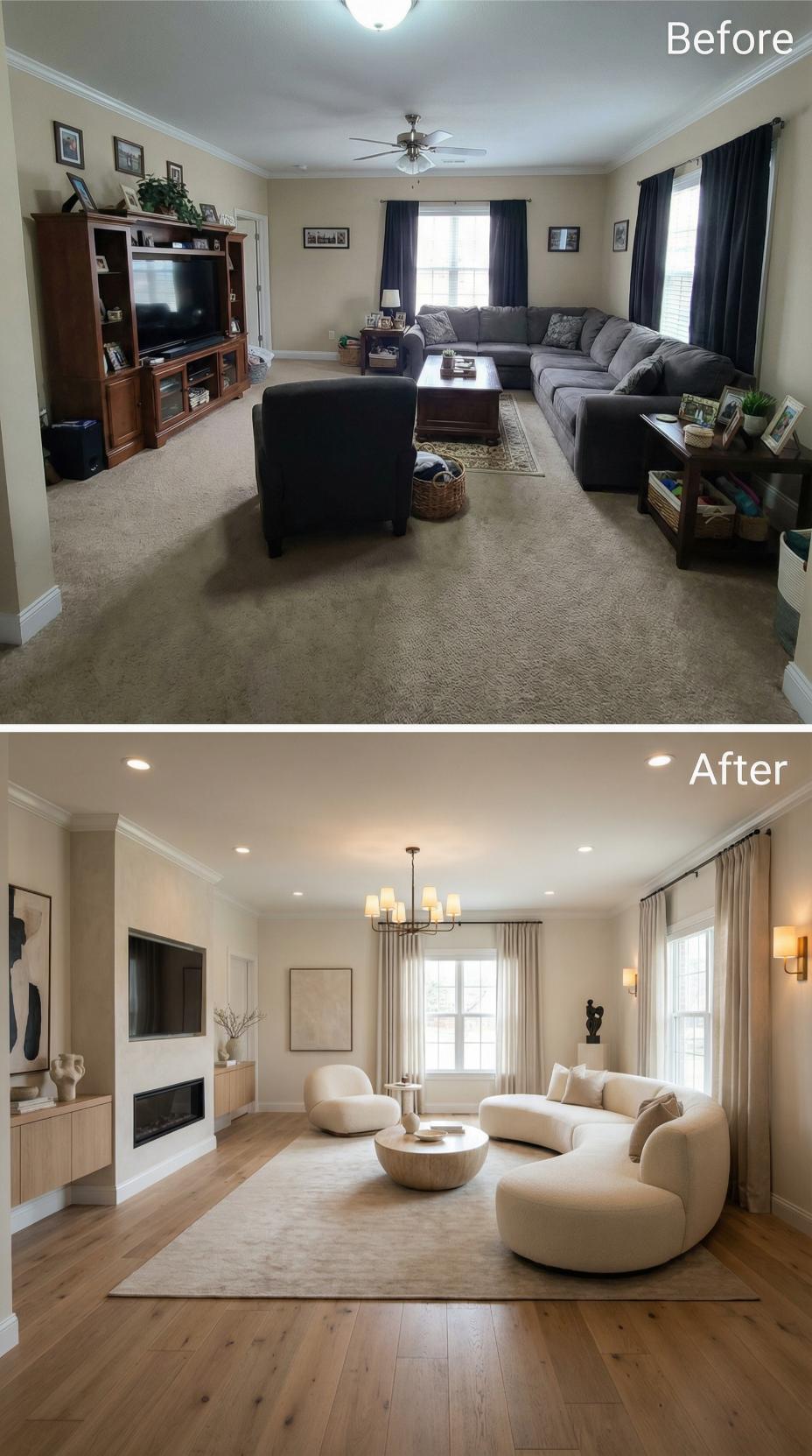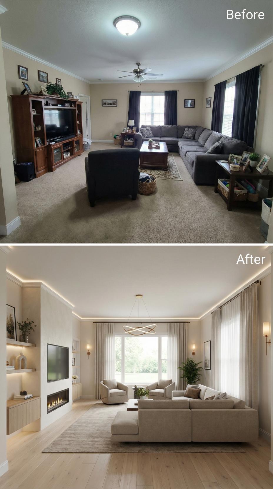 Warm wood flooring and elegant cove lighting replace basic carpet and harsh overhead fixtures in this stunning renovation. Built-in entertainment center with integrated fireplace creates a sleek focal point, while neutral beige sectional seating maintains comfort. Floor-to-ceiling curtains in soft taupe add height and sophistication, transforming the once-generic space into a refined contemporary retreat perfect for relaxation.