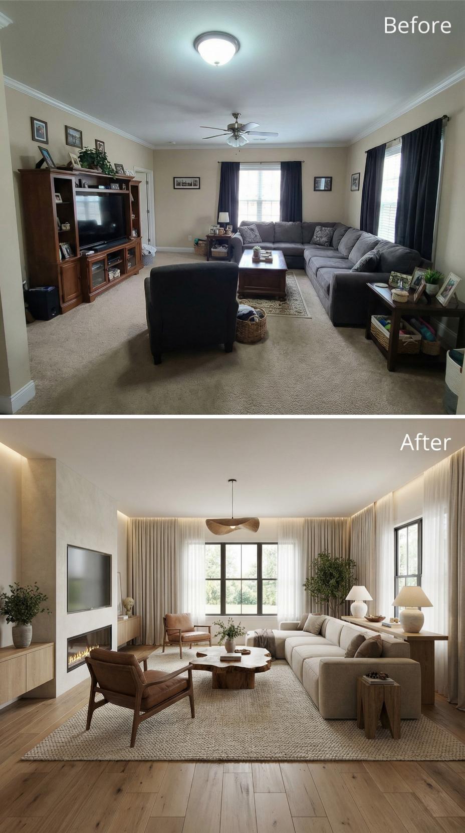 Natural wood floors replace standard carpeting while a stunning linear fireplace becomes the new focal point, eliminating the bulky entertainment center. Clean-lined sectional seating in neutral tones creates intimate conversation areas, complemented by mid-century accent chairs. Floor-to-ceiling linen curtains and warm pendant lighting transform the once-generic space into a sophisticated retreat with organic textures and refined architectural details.