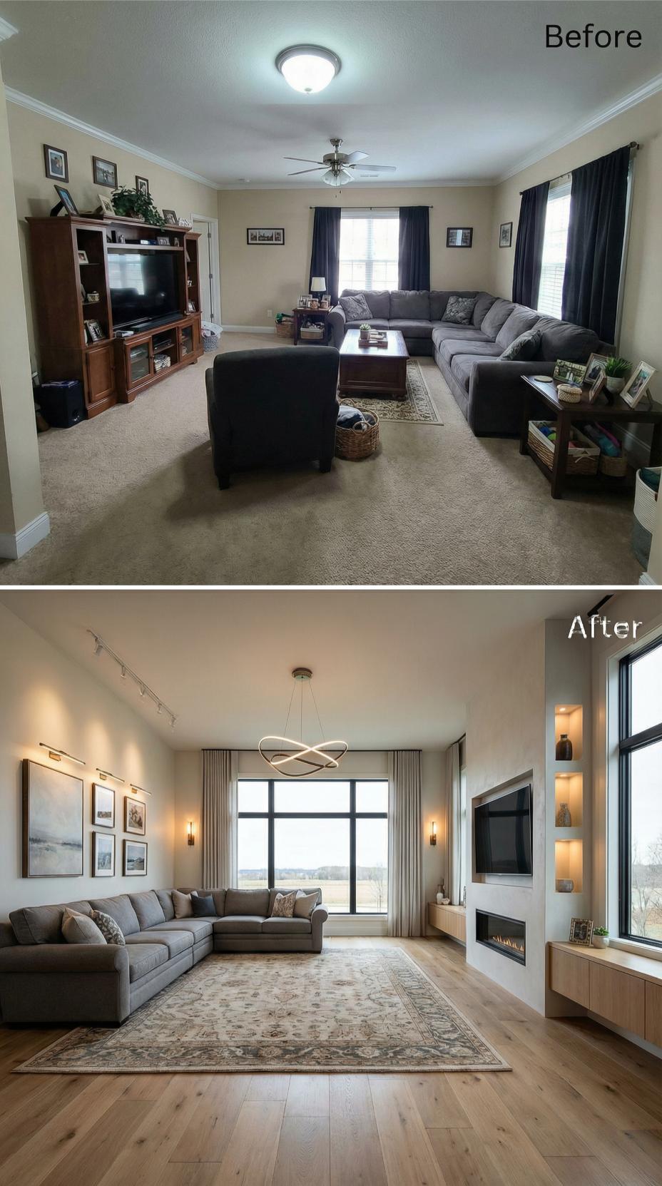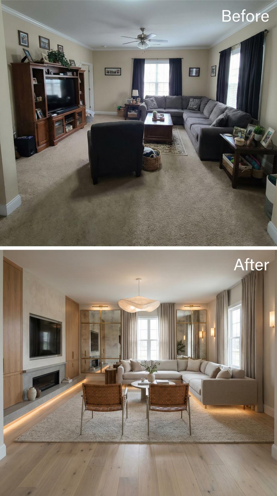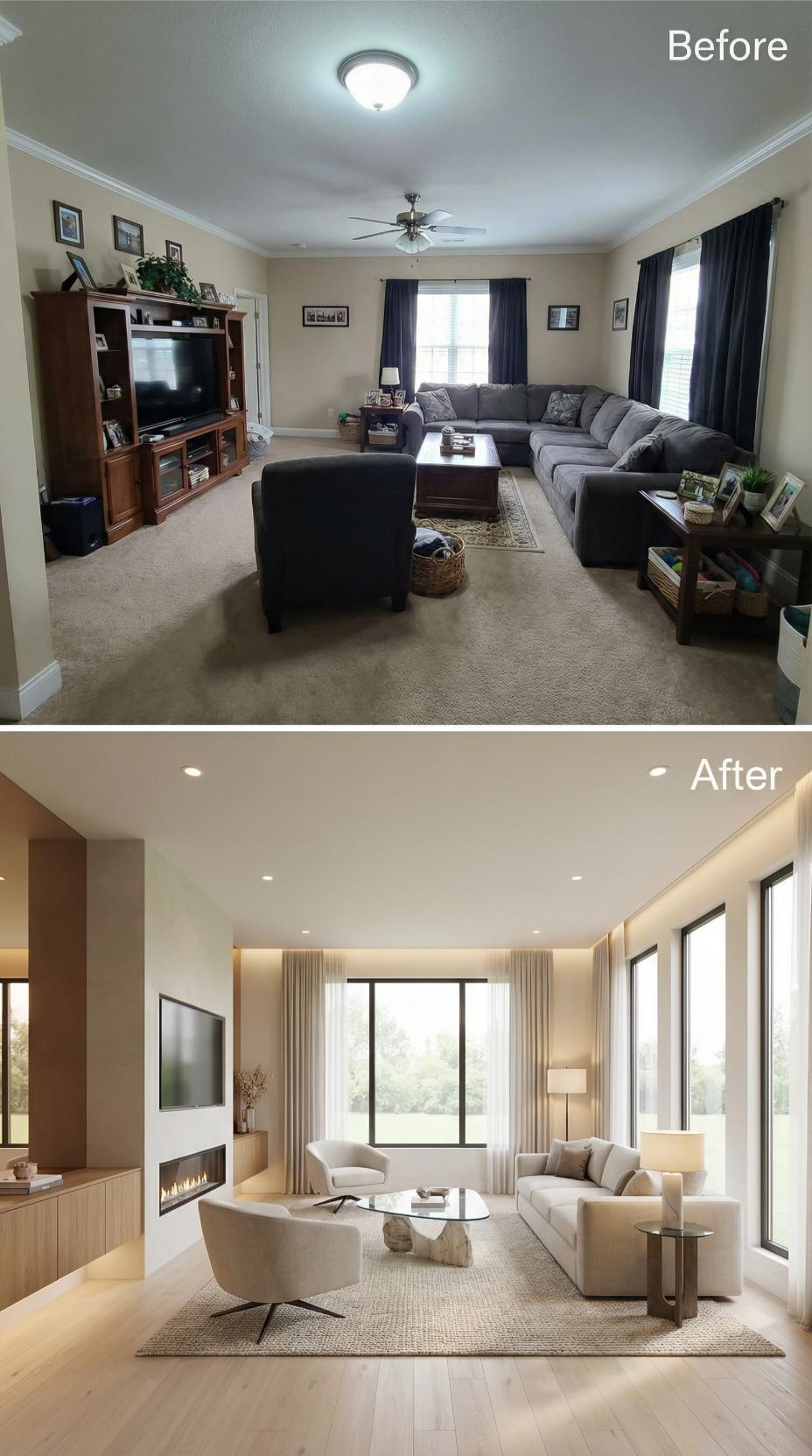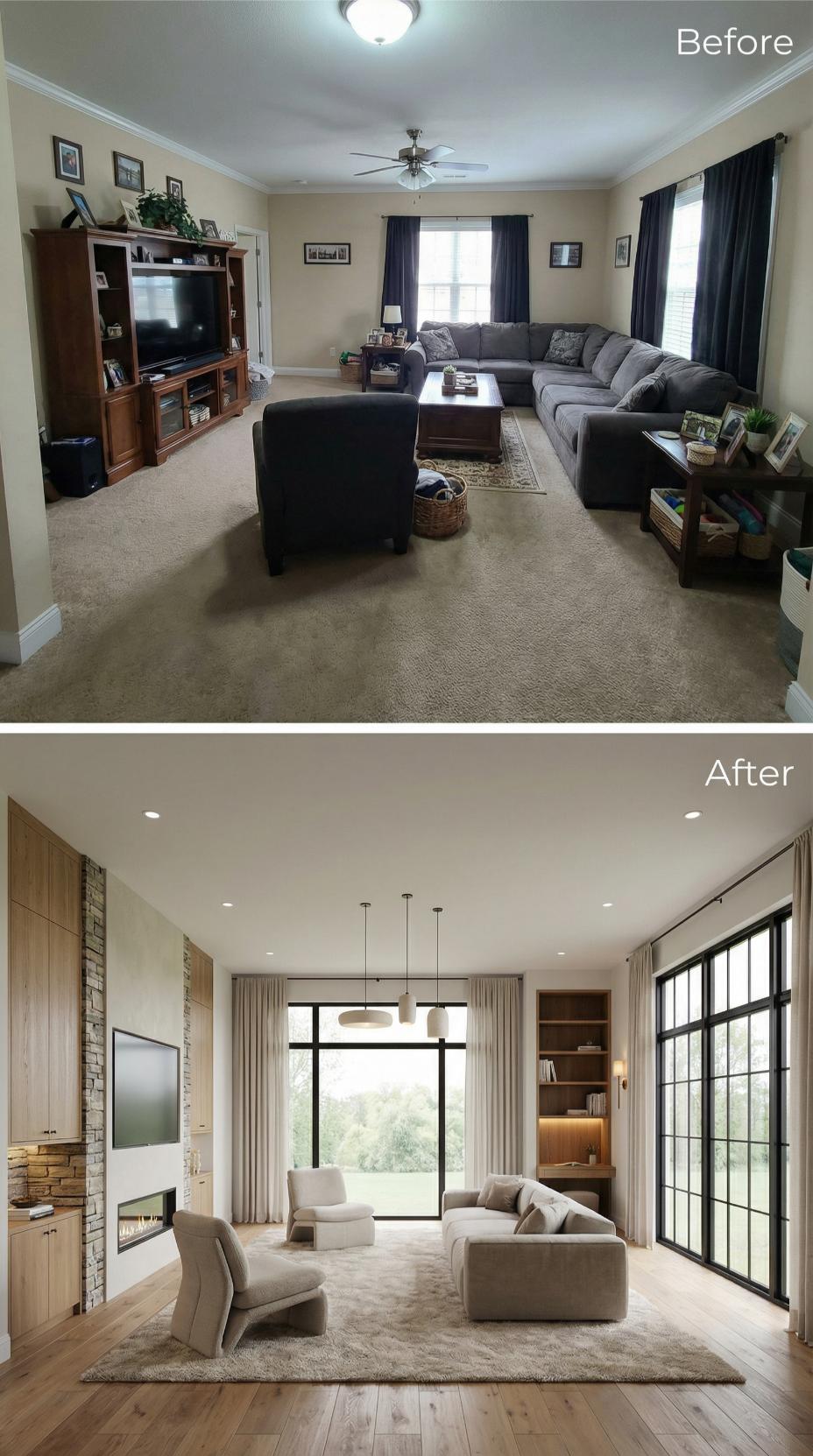 Some living rooms have all the right ingredients and still refuse to feel right. The seating is ample. The light shows up on time. The TV behaves. Yet the room stays oddly cramped, like the walls are leaning in for gossip. This gallery starts with a familiar problem: a living room that works, but feels tighter than it looks. The renovations solve it with designer-grade moves, not magic: lighter floors that stretch the footprint, oversized rugs that connect zones, ceiling-mounted drapery hung high and wide to lift the eye, built-ins that swallow clutter, and floating furniture layouts that reopen circulation. In several designs, more glass does the heavy lifting too — enlarged windows and added panels that pour in daylight and make the room read bigger on sight. 32 bold renovations that keep the bones, change the flow, and trade visual clutter for air, warmth, and serious design swagger.