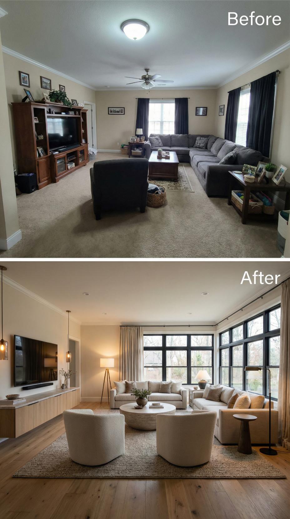 Dramatic black-framed windows replace standard openings, flooding this renovated space with natural light and architectural drama. The builder grade living room’s cramped furniture arrangement gives way to a sophisticated circular seating layout anchored by a plush curved sectional in warm beige. Rich walnut flooring and a streamlined media console create warmth, while pendant lighting and neutral linen curtains complete the upscale transformation.