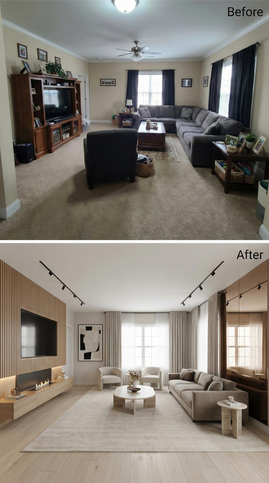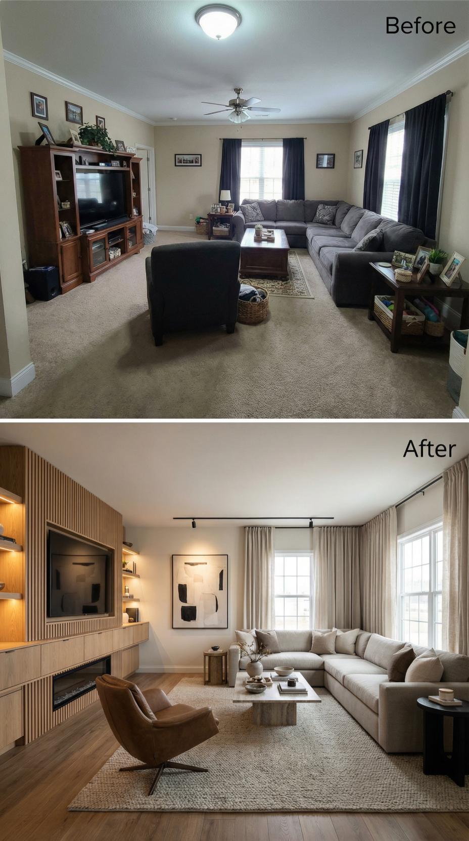 Warm wood tones and dated furnishings gave way to sleek sophistication in this stunning makeover. The transformation introduces a linear fireplace flanked by illuminated fluted wood panels, creating a dramatic focal point. Contemporary brass lighting replaces the ceiling fan, while light oak flooring and neutral sectional seating establish an airy, refined atmosphere that feels both luxurious and inviting.