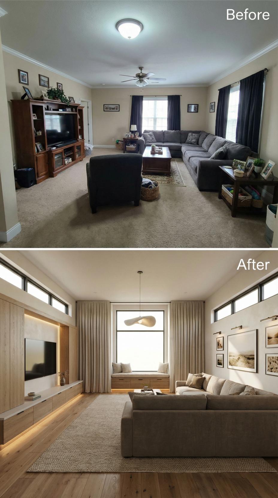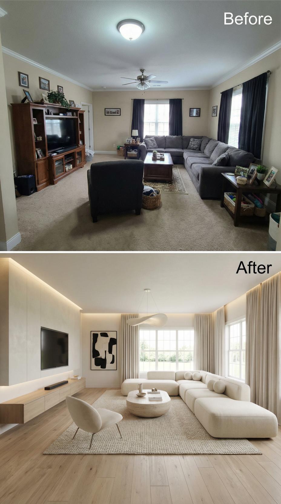 Natural wood planks replace standard carpet while sleek built-in cabinetry eliminates the bulky entertainment center from this builder grade living room. Warm LED strip lighting creates ambient glow behind the wall-mounted TV, while neutral linen curtains and a streamlined sectional maintain the serene, contemporary aesthetic. Clean lines and integrated storage transform the once-cluttered space into a sophisticated retreat.