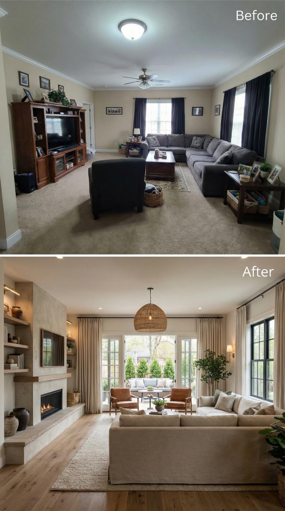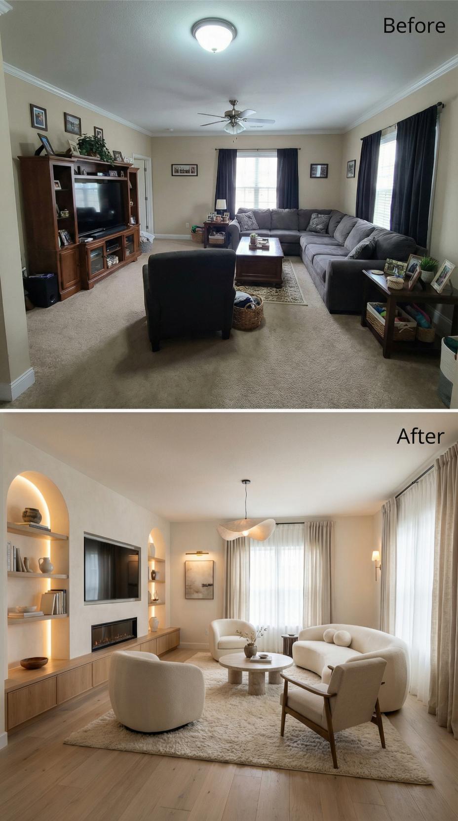 Warm wood built-ins with integrated fireplace replace the bulky entertainment center, creating a stunning focal wall that anchors the redesigned space. Light neutral furnishings and flowing curtains soften the room’s edges, while strategic lighting transforms the once-cramped builder grade living room into an airy, sophisticated retreat. Natural textures and organic shapes bring effortless elegance to every corner.