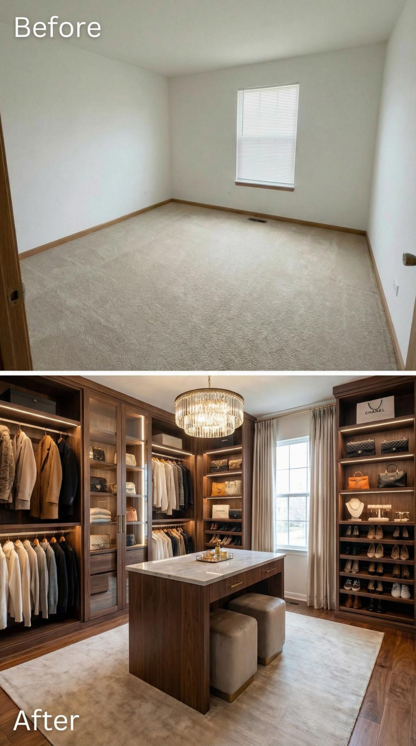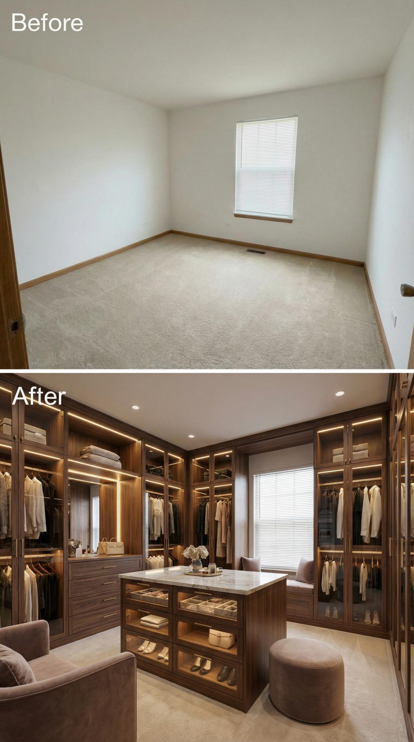 Rich walnut built-in cabinetry transforms an empty bedroom into a sophisticated dressing room worthy of a luxury boutique. Custom shelving displays designer handbags and shoes like precious artifacts, while LED strip lighting illuminates every corner. The central island provides additional storage and a marble surface for accessories, creating the ultimate organizational paradise.
