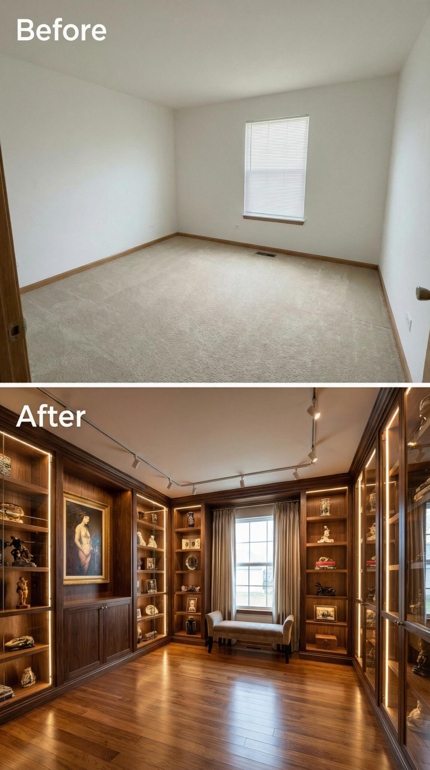 Custom walnut built-in shelving transforms an empty carpeted bedroom into a refined personal library. Rich hardwood floors replace dated carpeting while floor-to-ceiling cabinetry maximizes storage and display space. Track lighting illuminates collectibles and artwork throughout the shelving units. Elegant drapery frames the window, creating a cozy reading nook with an upholstered bench that invites quiet contemplation among treasured books and art pieces.