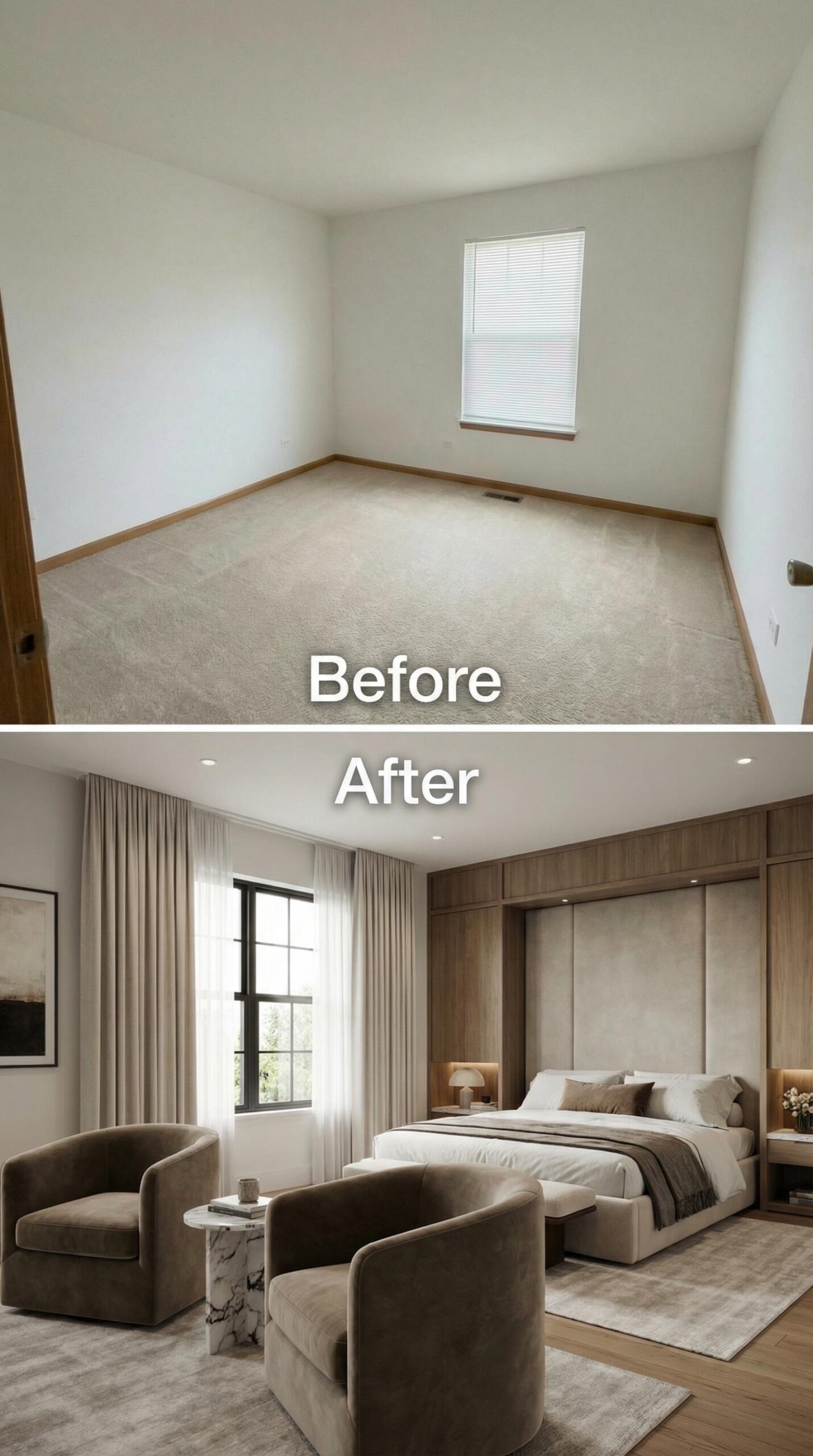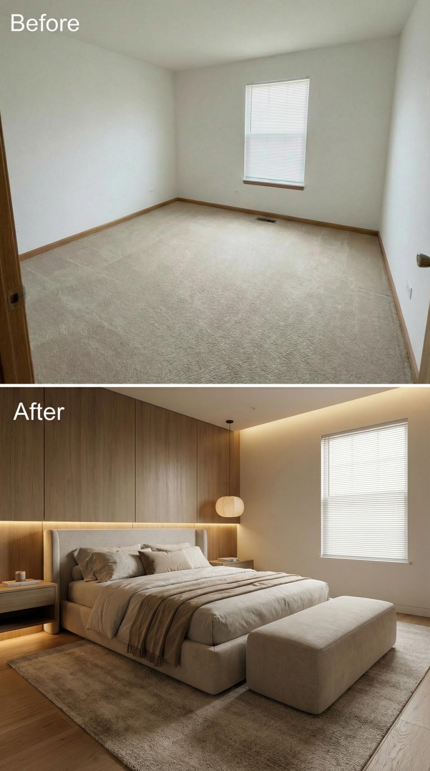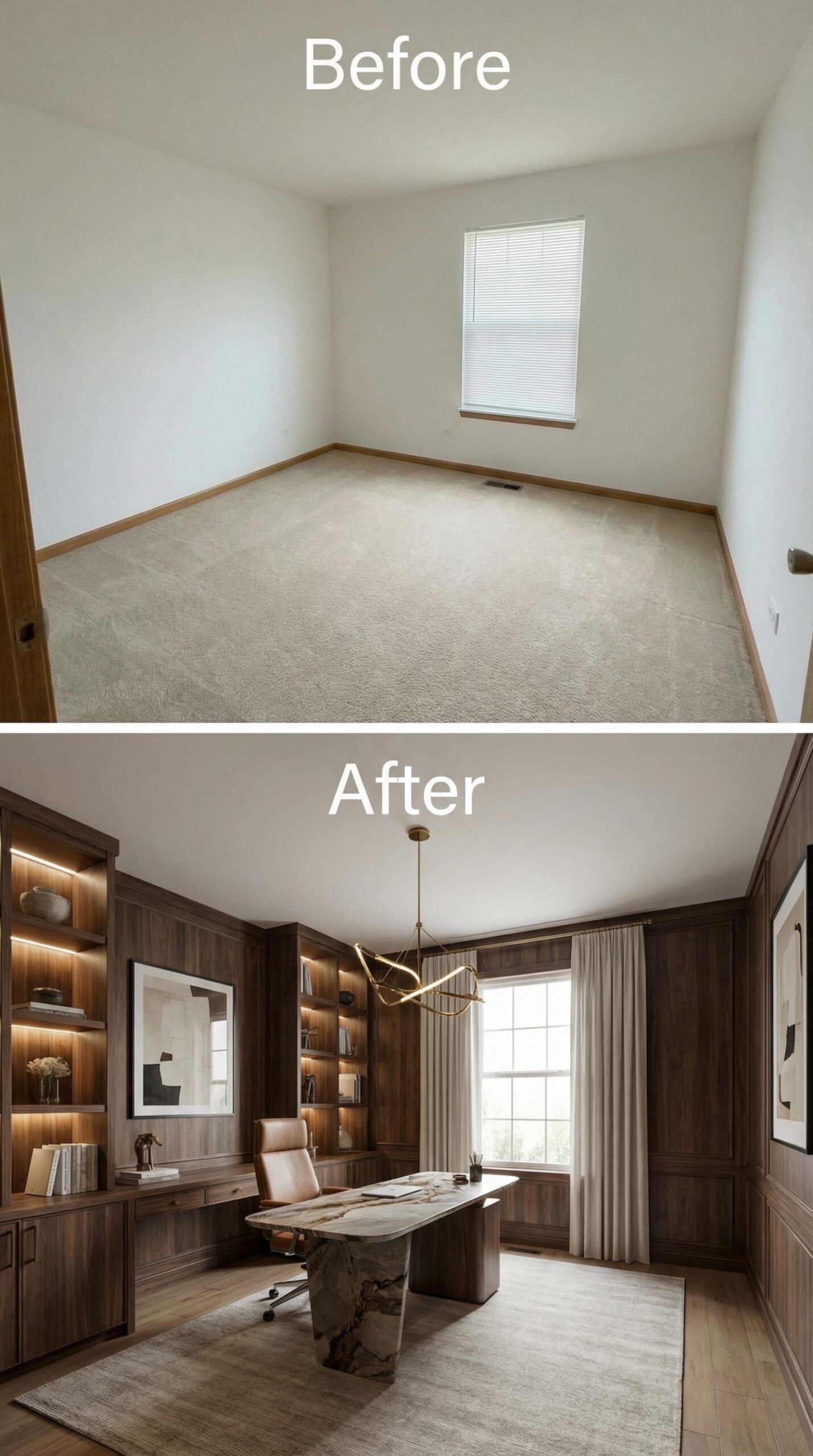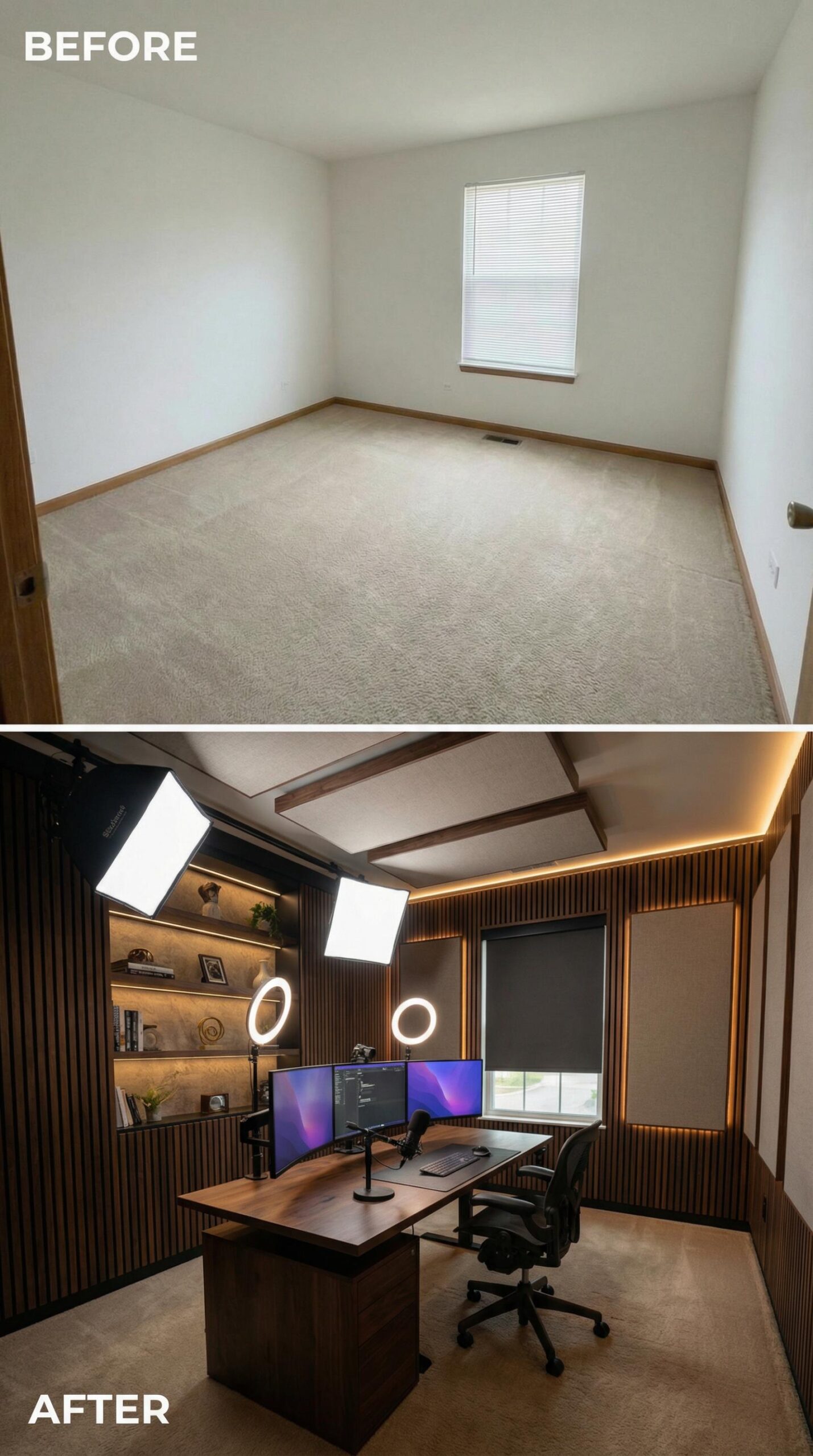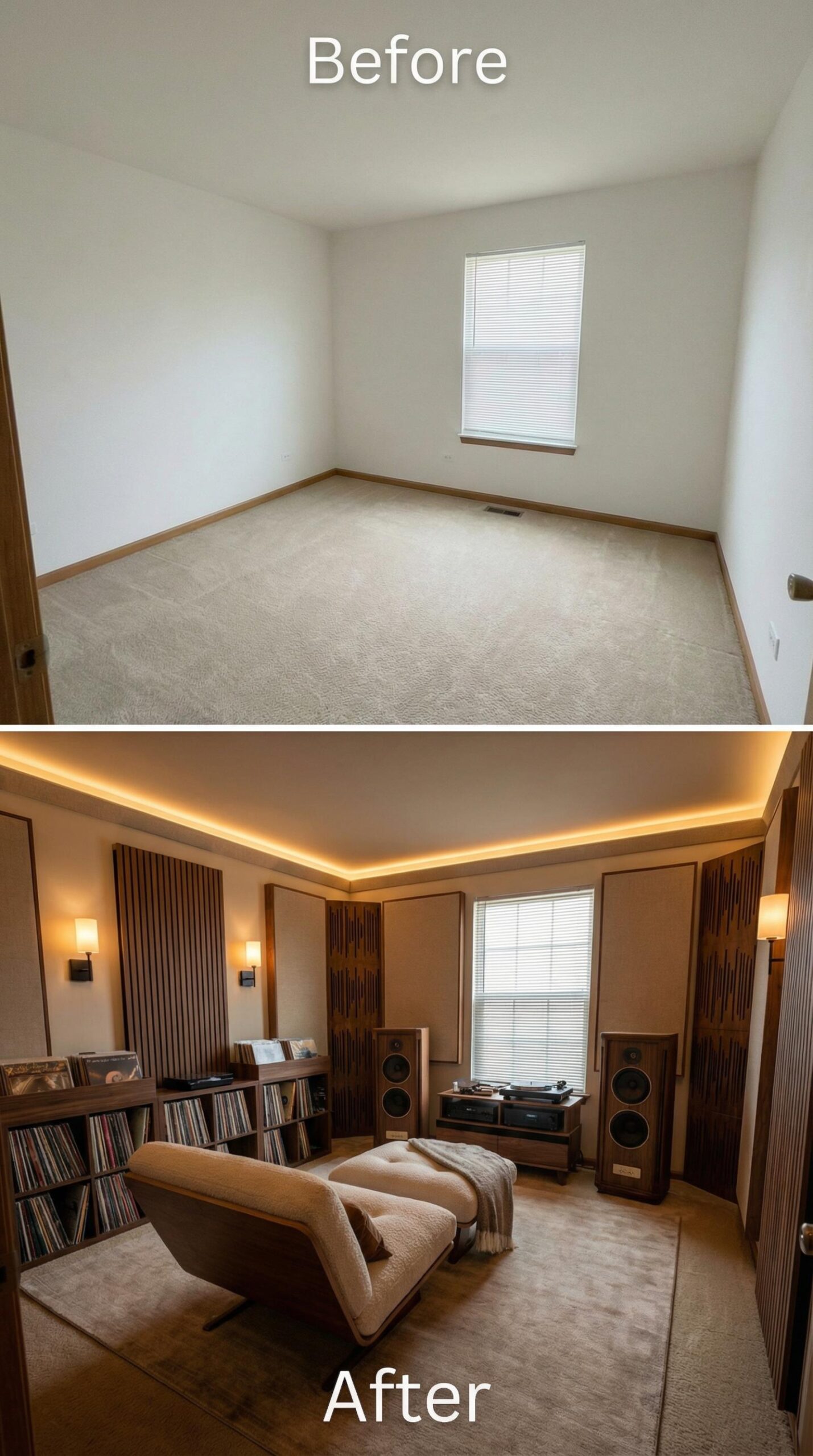 Dramatic tray ceiling lighting transforms this bland spare room into an audiophile’s dream retreat. Rich walnut wood paneling creates stunning acoustic treatment while warming the neutral palette. The strategically placed lounge chair faces professional-grade tower speakers, while vinyl record storage adds both function and vintage charm. Ambient cove lighting and geometric wall treatments elevate the space from ordinary to extraordinary.