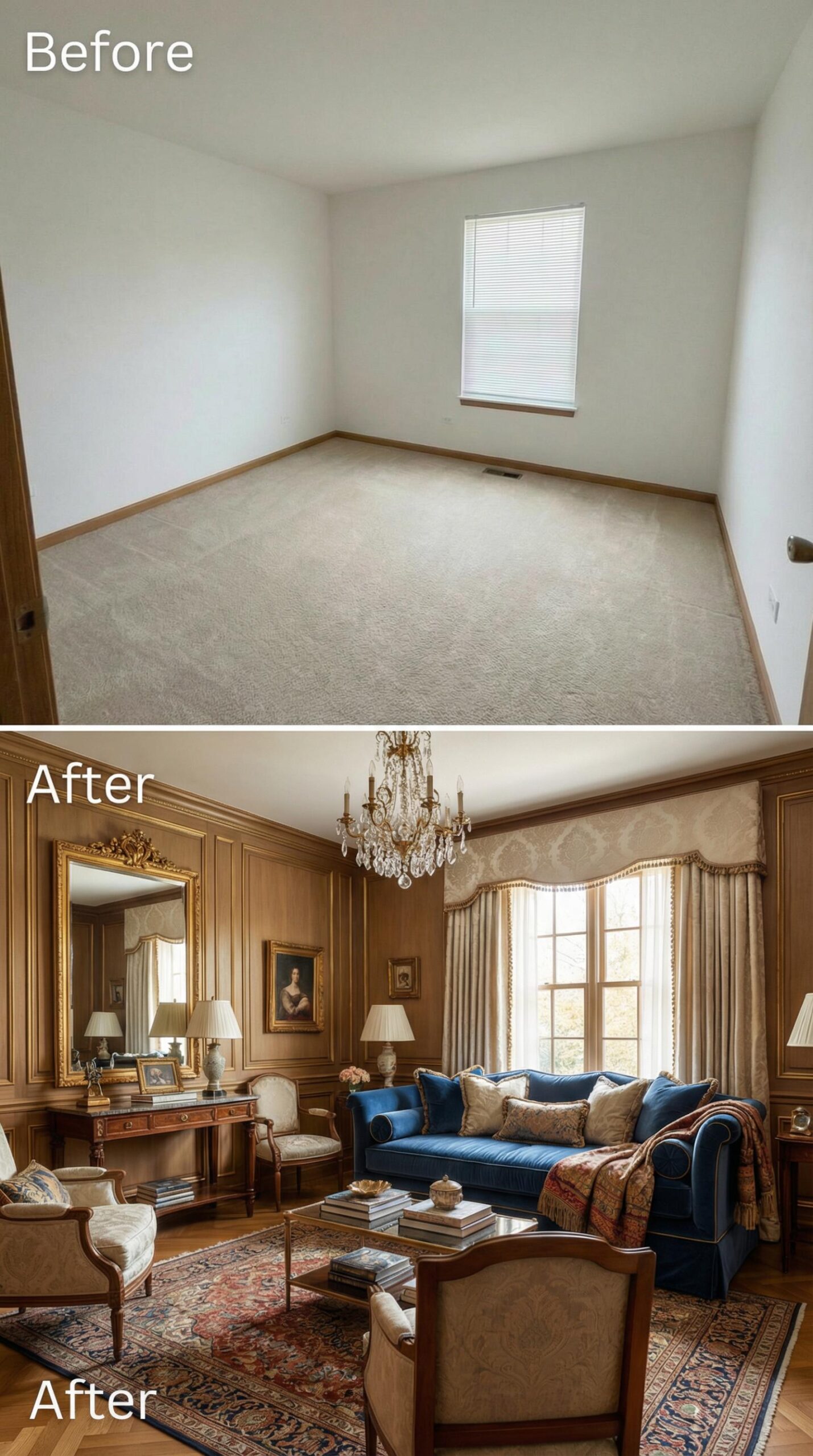 Rich walnut wood paneling transforms bare walls into an elegant architectural masterpiece. Navy velvet Chesterfield seating anchors the sophisticated color palette, while gold-framed portraits and classic table lamps create intimate reading nooks. An ornate crystal chandelier crowns the space, casting warm light across Persian rugs and leather-bound book collections that complete this luxurious transformation.