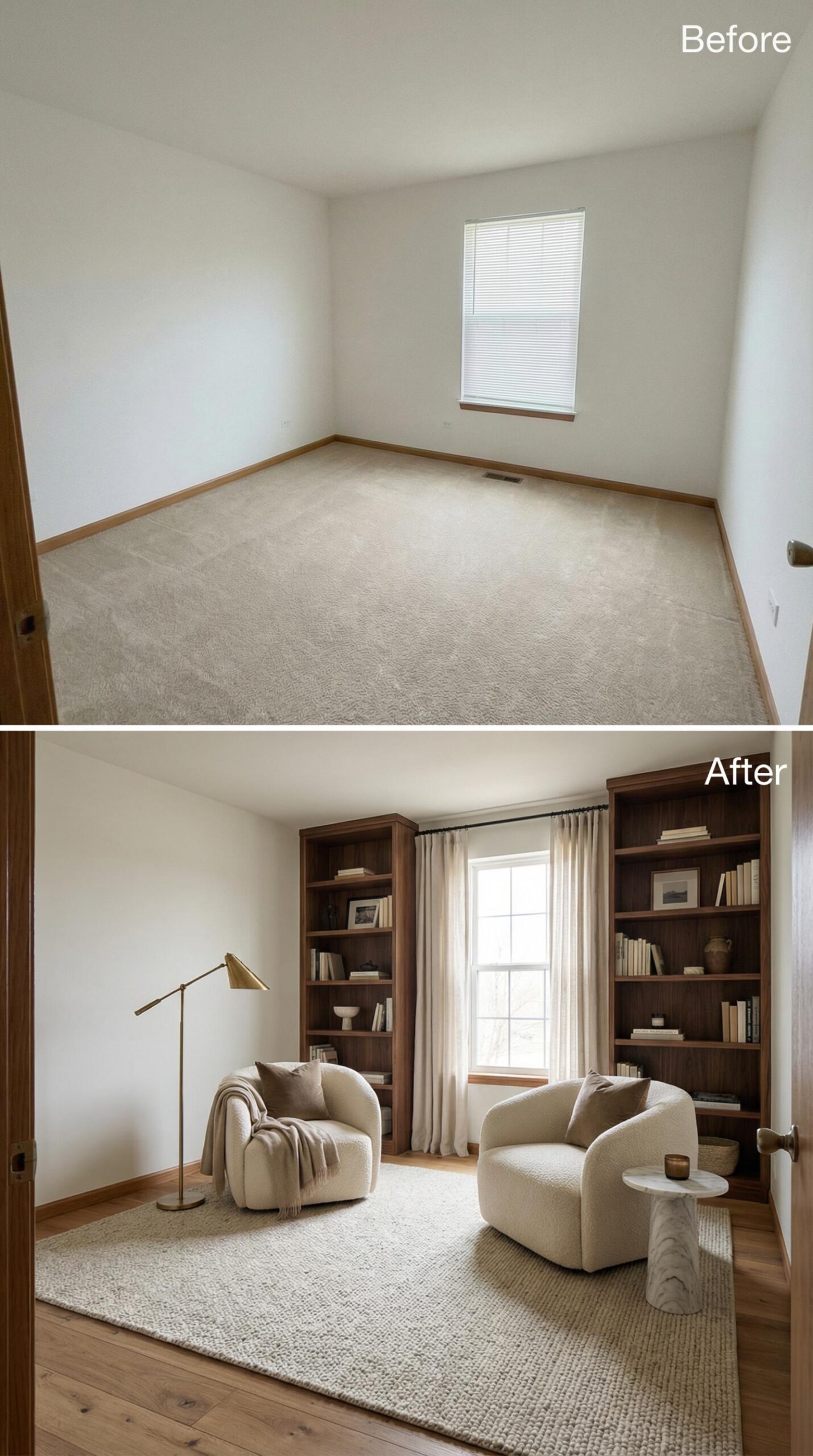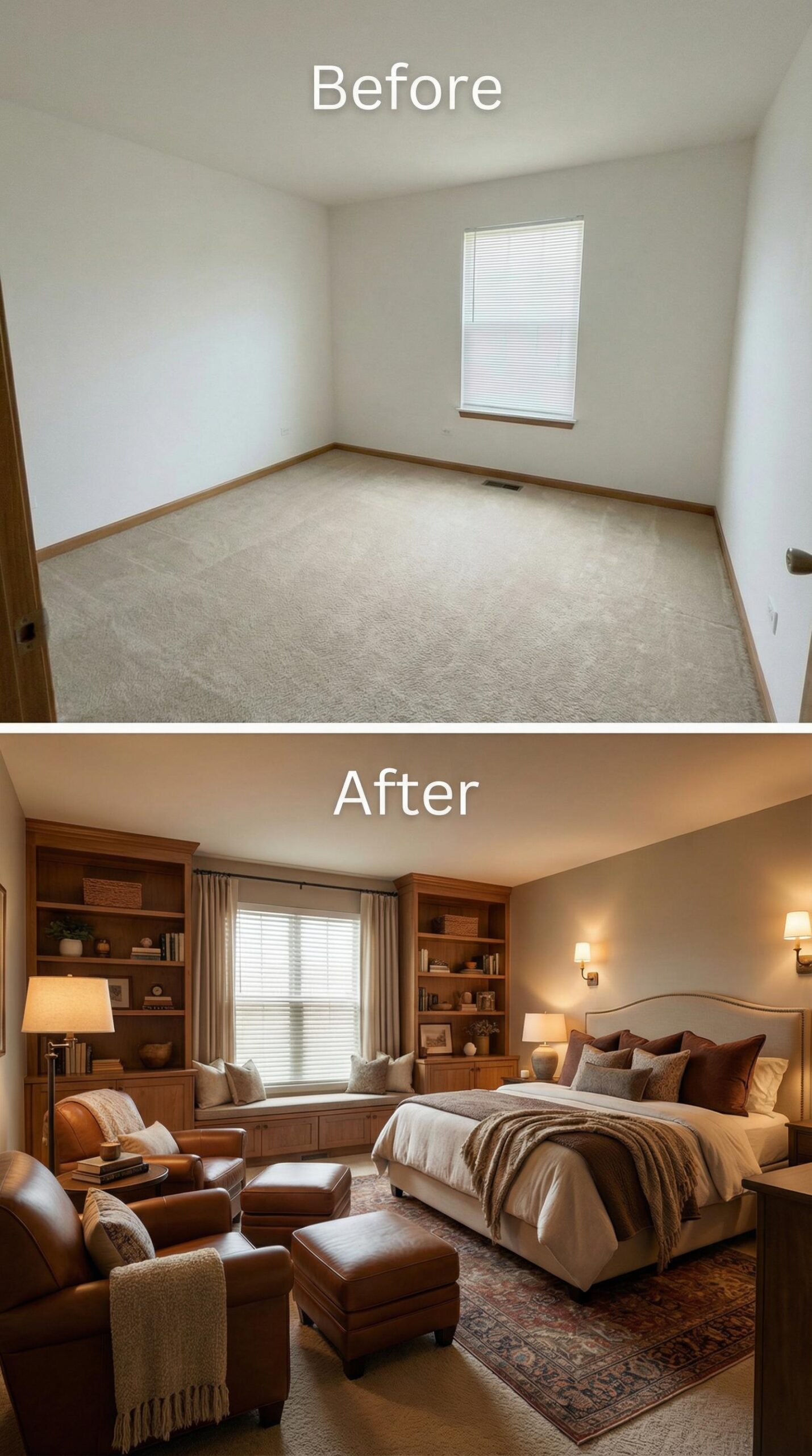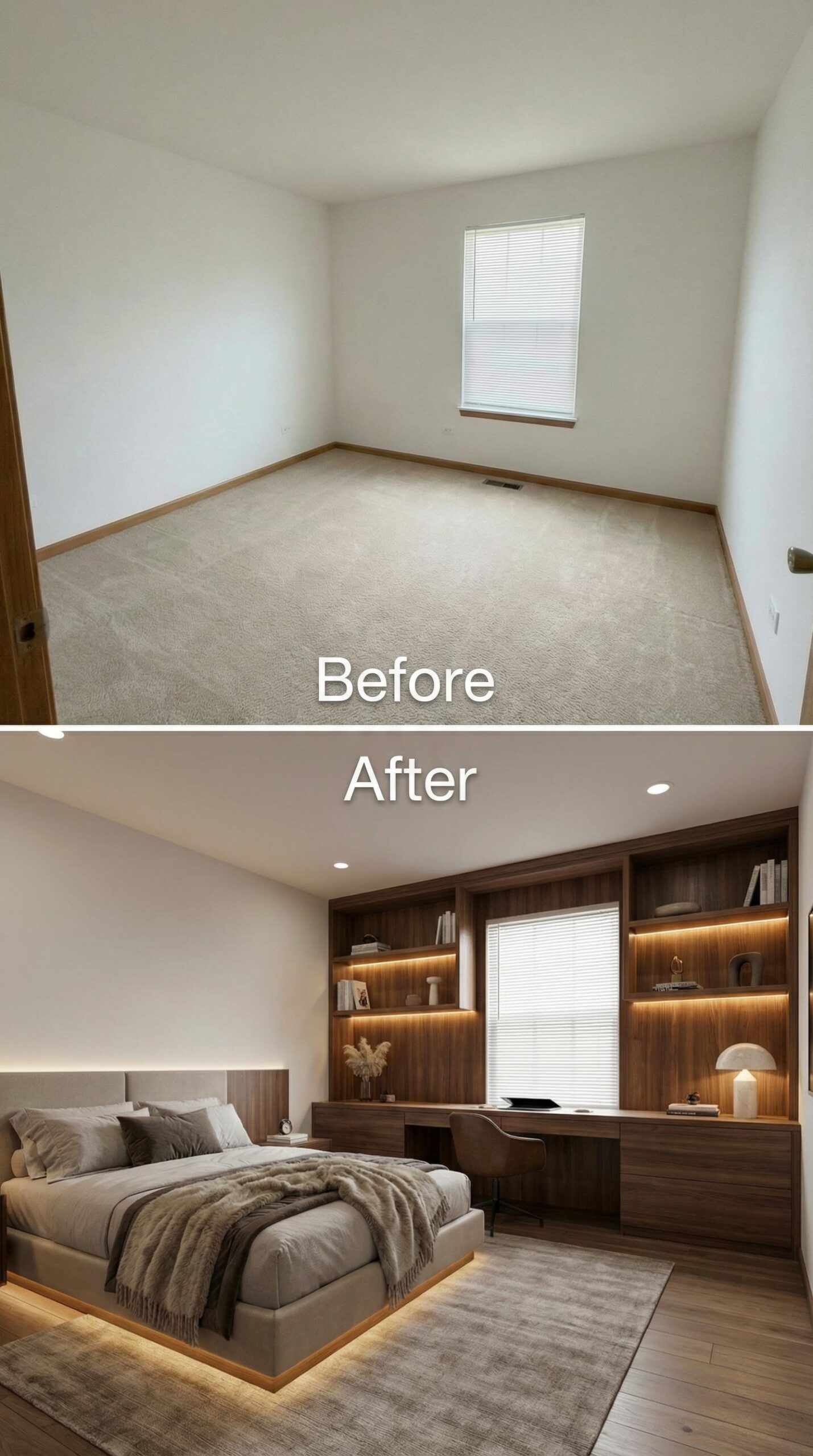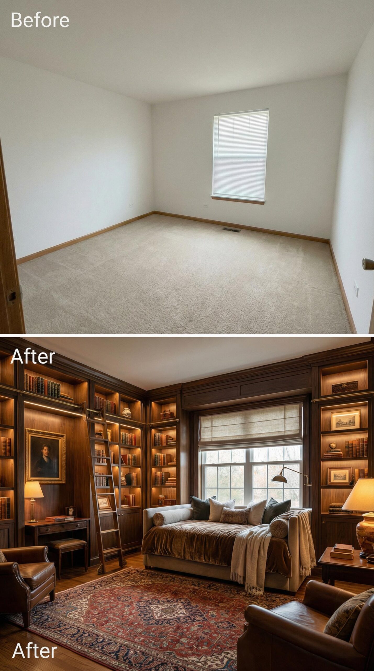 Floor-to-ceiling mahogany built-ins transform bare walls into a sophisticated library sanctuary. Rich wood paneling creates dramatic contrast against the original beige palette, while integrated LED strip lighting illuminates leather-bound volumes. A rolling library ladder adds authentic charm, and the neutral chaise lounge provides the perfect reading nook beneath the window’s natural light.