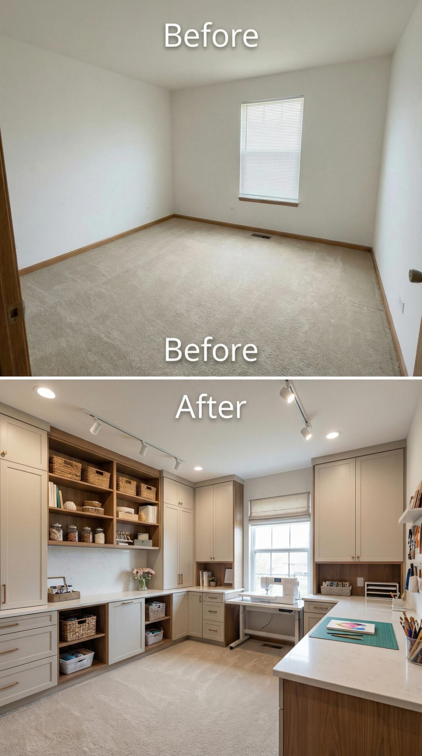 Built-in cabinetry transforms an empty bedroom into a highly organized creative workspace. Light wood cabinets with sleek hardware maximize vertical storage while open shelving displays supplies in woven baskets. Quartz countertops provide ample work surface, and track lighting ensures proper task illumination. The L-shaped layout creates distinct zones for different crafting activities while maintaining an open, airy feel throughout the room.
