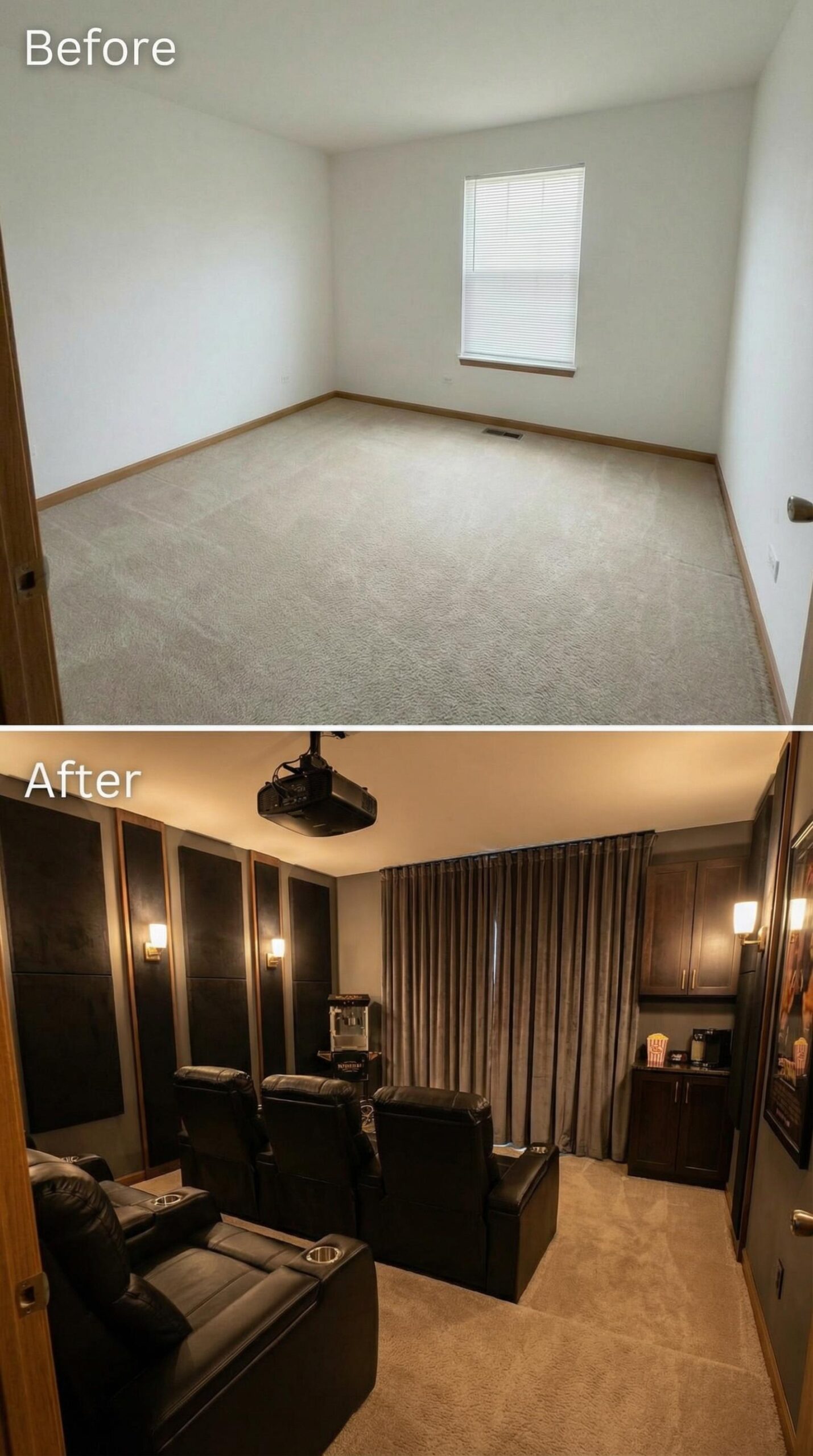 Dark walnut built-in cabinetry transforms this bland spare room into an entertainment sanctuary. Rich chocolate leather recliners create stadium-style seating, while a ceiling-mounted projector delivers big-screen thrills. Heavy curtains block exterior light completely, and ambient wall sconces provide perfect mood lighting for movie nights without screen glare.