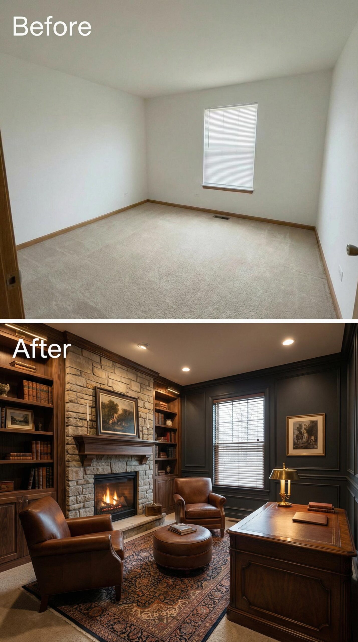 Empty Room Becomes Distinguished Gentleman’s Study with Stone Fireplace