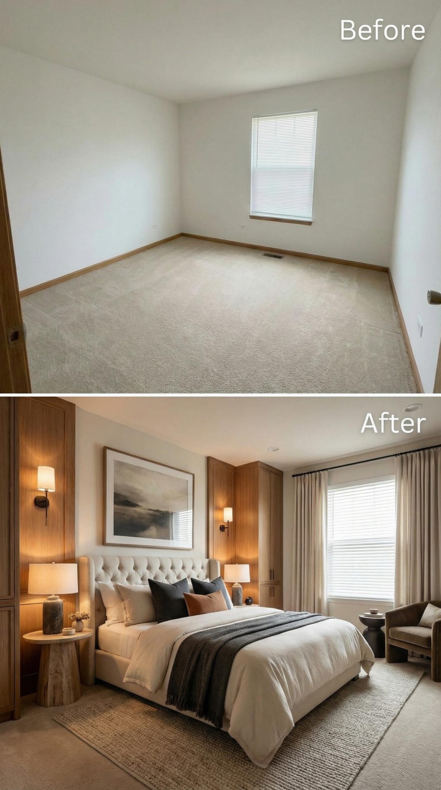 Warm walnut paneling creates an elegant backdrop for this sophisticated bedroom transformation. Rich wood flooring grounds the neutral palette while layered bedding in cream and taupe tones adds visual depth. Modern wall sconces provide ambient lighting, and floor-to-ceiling curtains frame the window beautifully. The upholstered headboard anchors the space with its clean lines and luxurious texture.