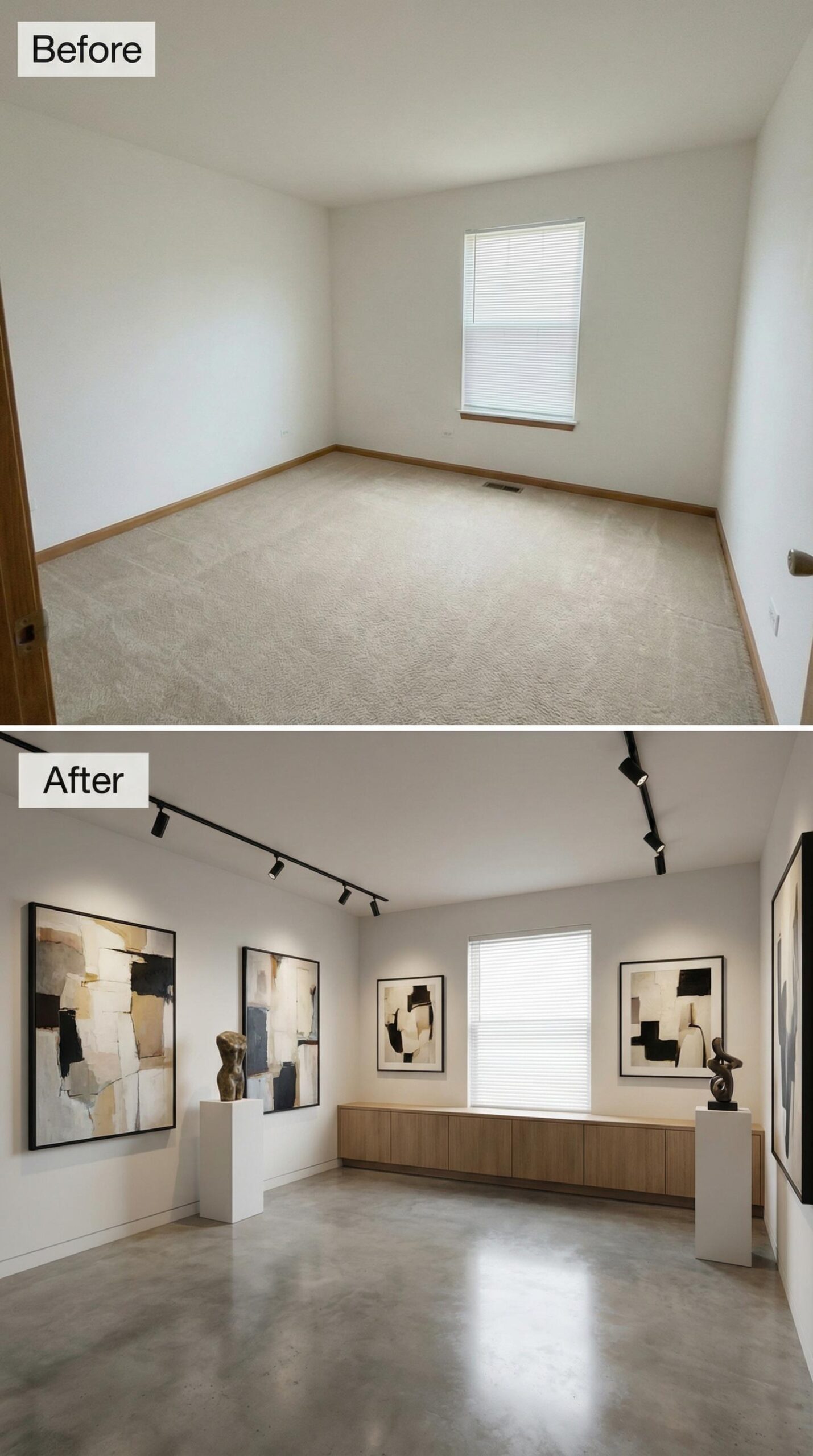 Museum-quality track lighting transforms an ordinary spare room into a sophisticated art gallery. Abstract paintings in muted tones create visual interest against crisp white walls, while sculptural pieces rest on sleek white pedestals. The warm walnut credenza provides both storage and display space, perfectly complementing the polished concrete floors that reflect the carefully curated lighting above.
