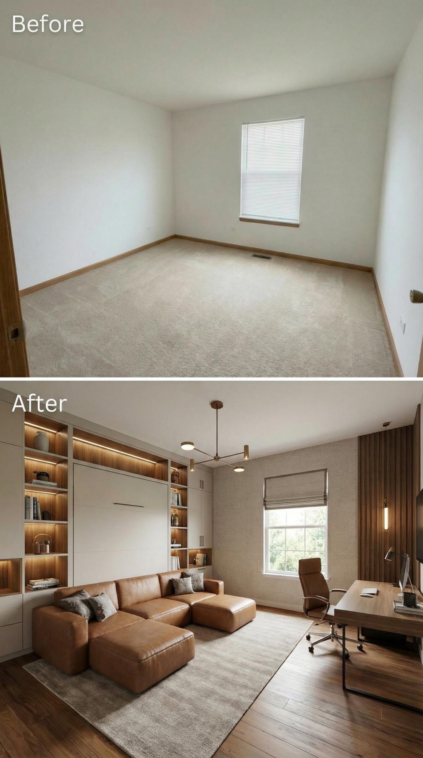 Built-in shelving with warm wood accents transforms an empty spare room into a sophisticated dual-purpose sanctuary. The Murphy bed disappears behind sleek cabinetry, while cognac leather seating anchors the workspace below. Rich walnut tones complement neutral walls, creating seamless flow between professional productivity and comfortable relaxation. Modern pendant lighting and textured window treatments complete this brilliant space-saving solution.
