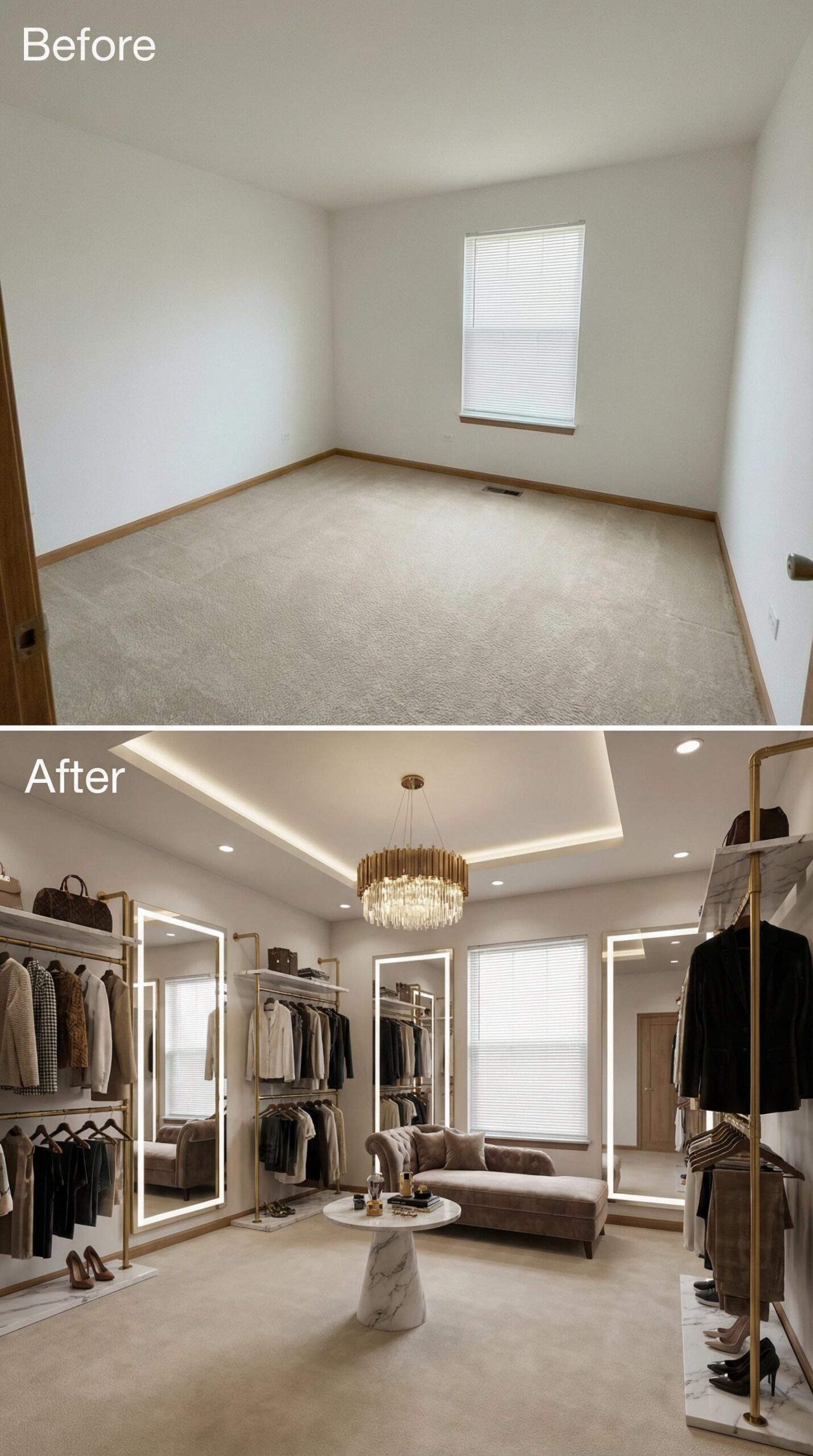 Professional organizers transformed this empty spare room into a boutique-style dressing room featuring gold-finished clothing racks, integrated LED lighting, and mirrored panels. The marble-base ottoman provides seating while dramatic recessed ceiling lights and a statement crystal chandelier create an upscale retail atmosphere. Custom storage maximizes every inch while maintaining an airy, sophisticated aesthetic.