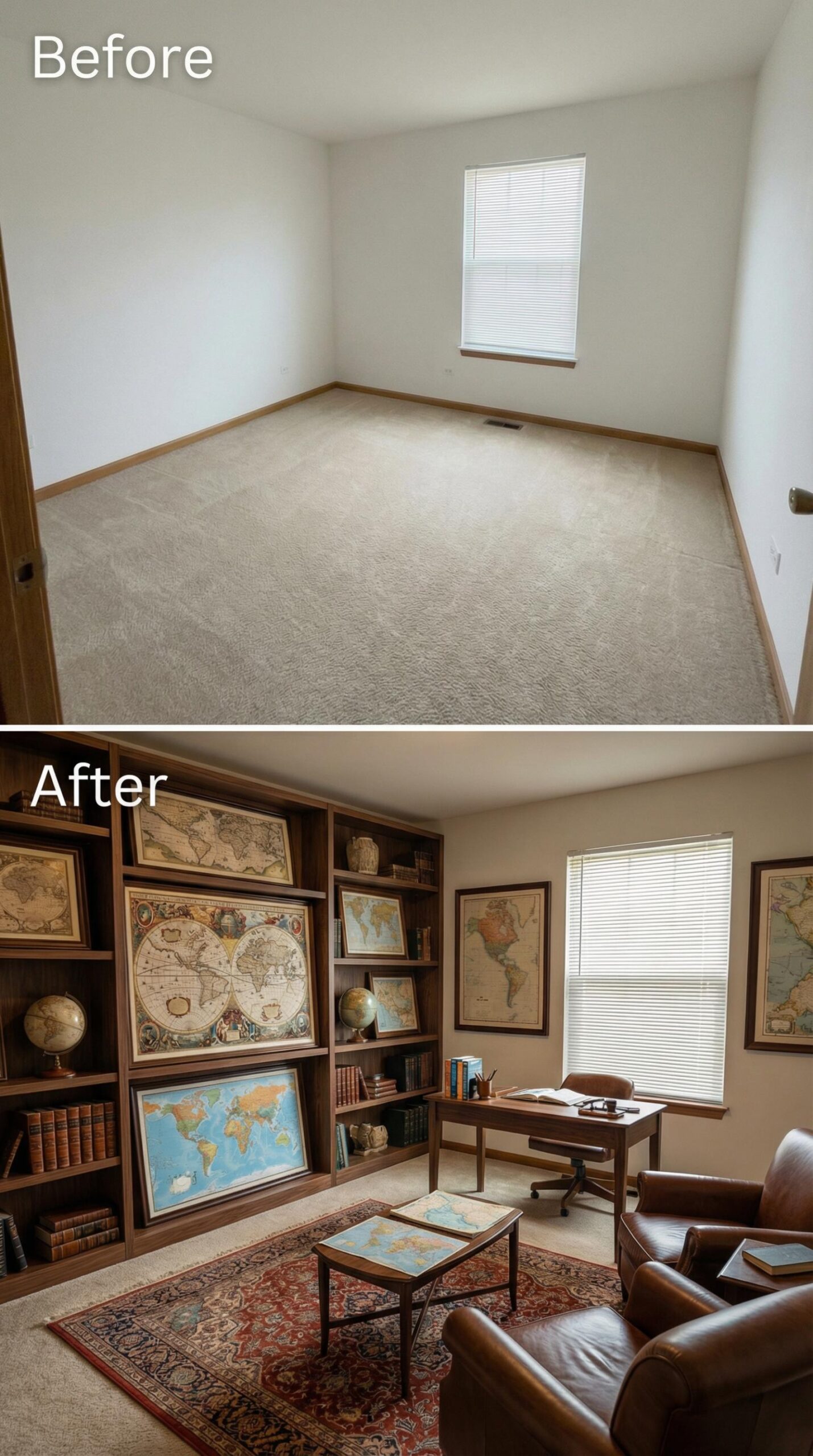 Empty Room Becomes Explorer’s Study with Built-In Shelving and Vintage Maps