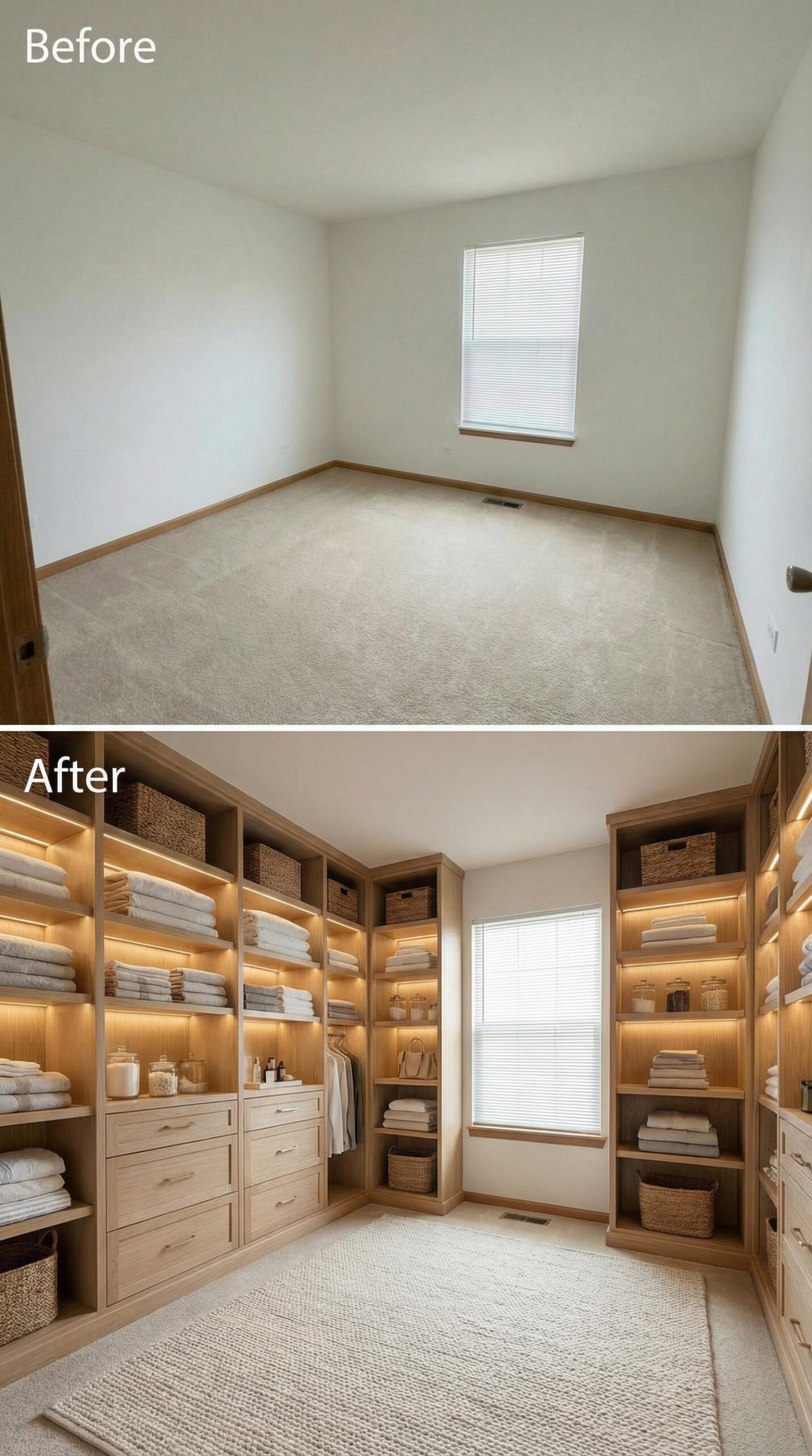 Custom blonde wood built-ins transform an empty bedroom into a luxurious linen storage sanctuary. Integrated LED strip lighting illuminates each shelf compartment, creating a boutique hotel atmosphere while showcasing neatly folded towels and bedding. Natural wicker baskets add textural contrast against the smooth wood surfaces, while strategically placed drawers maximize storage efficiency for smaller items throughout this walk-in closet design.