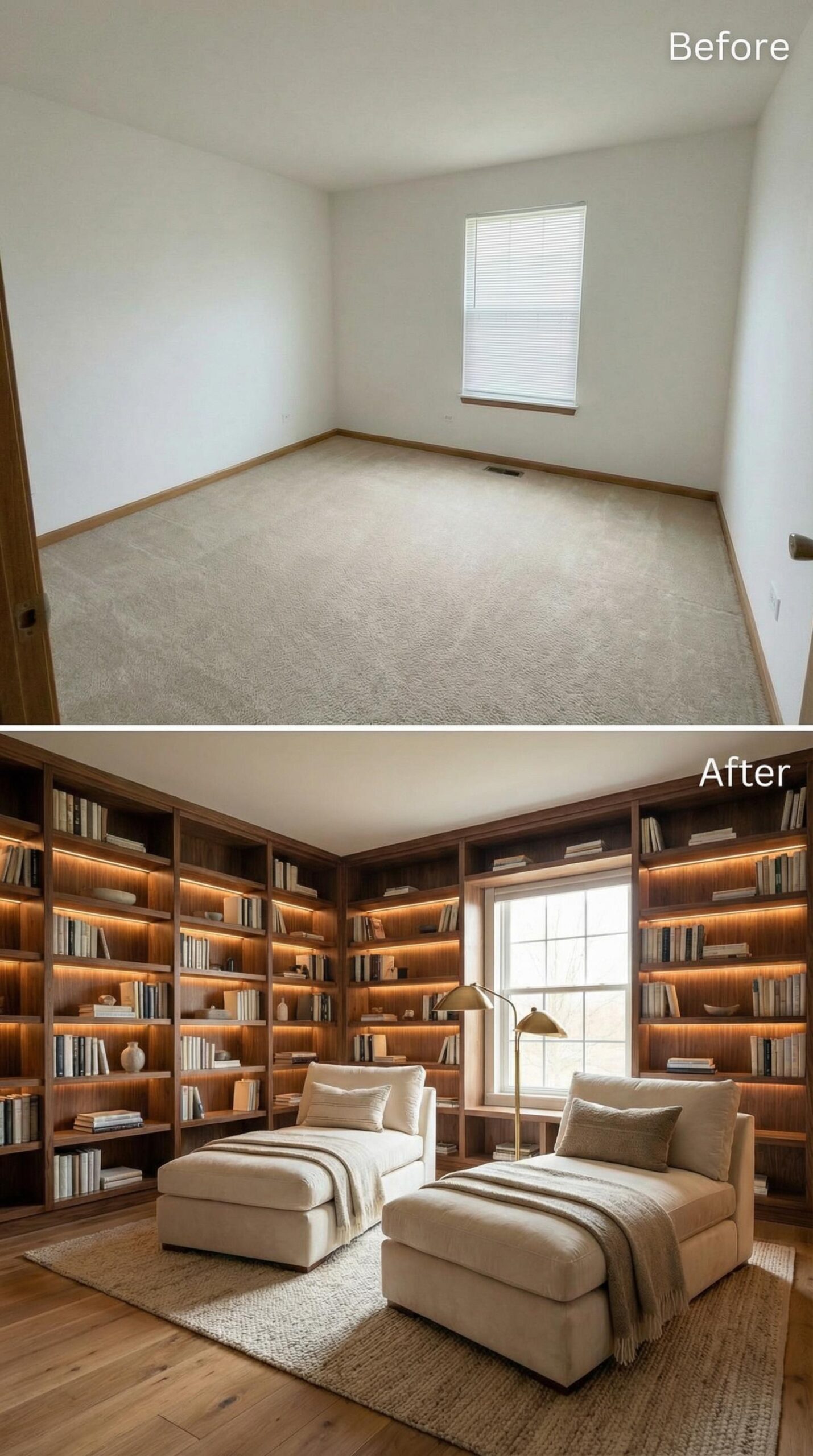 Built-in walnut bookshelves wrap two entire walls, transforming this bland space into a sophisticated home library. Warm LED strip lighting illuminates every shelf level, creating ambient glow throughout the room. Two oversized cream linen lounge chairs with matching ottomans anchor the seating area, while natural jute area rugs define the reading zone. Rich wood tones contrast beautifully against neutral walls, establishing perfect balance between warmth and tranquility.