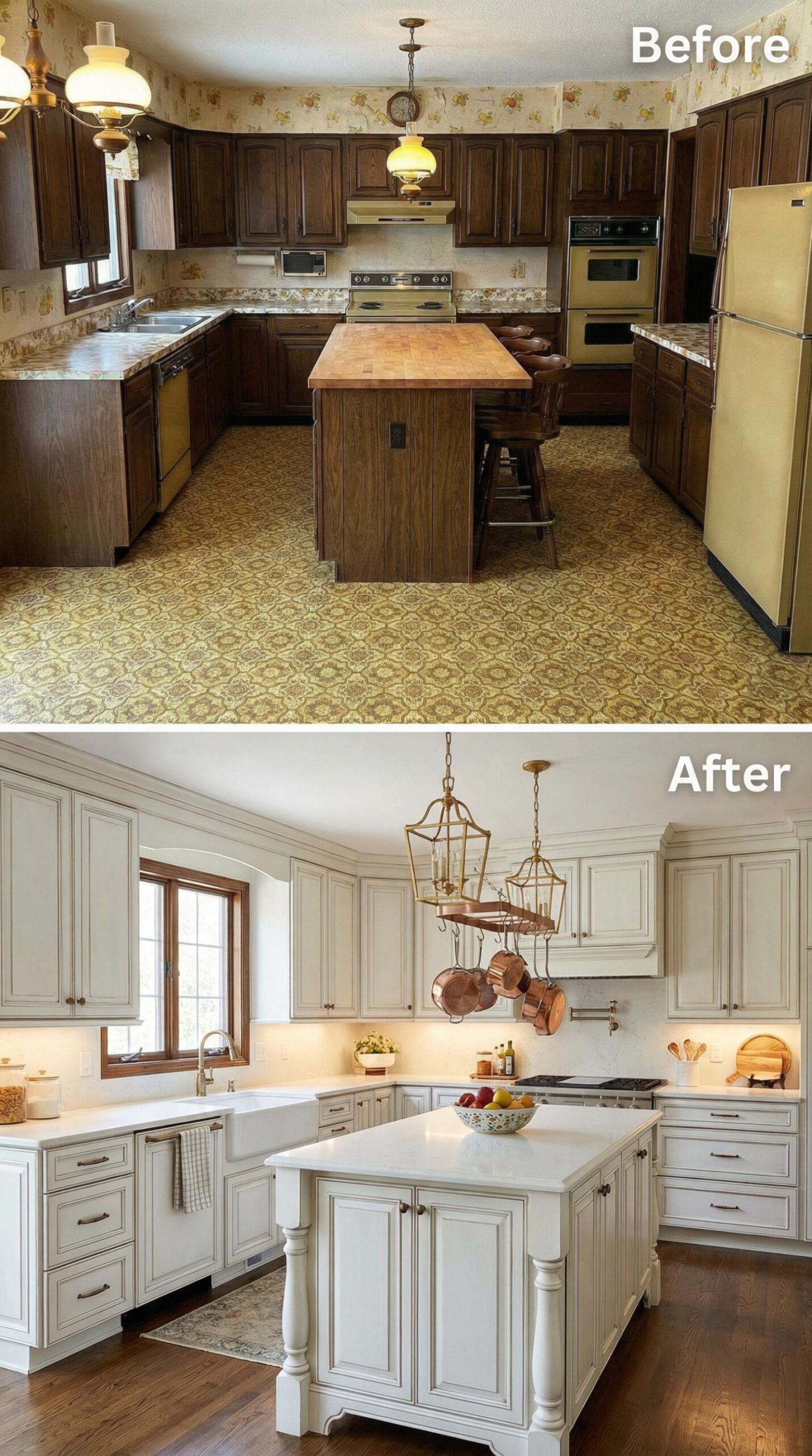 Dark wood cabinets transform into sophisticated cream-painted cabinetry with elegant hardware and clean lines. White quartz countertops replace busy granite patterns while lantern-style pendant lights add refined illumination. The original layout remains functional, but updated finishes, farmhouse sink, and copper pot rack create a timeless aesthetic that balances warmth with brightness.