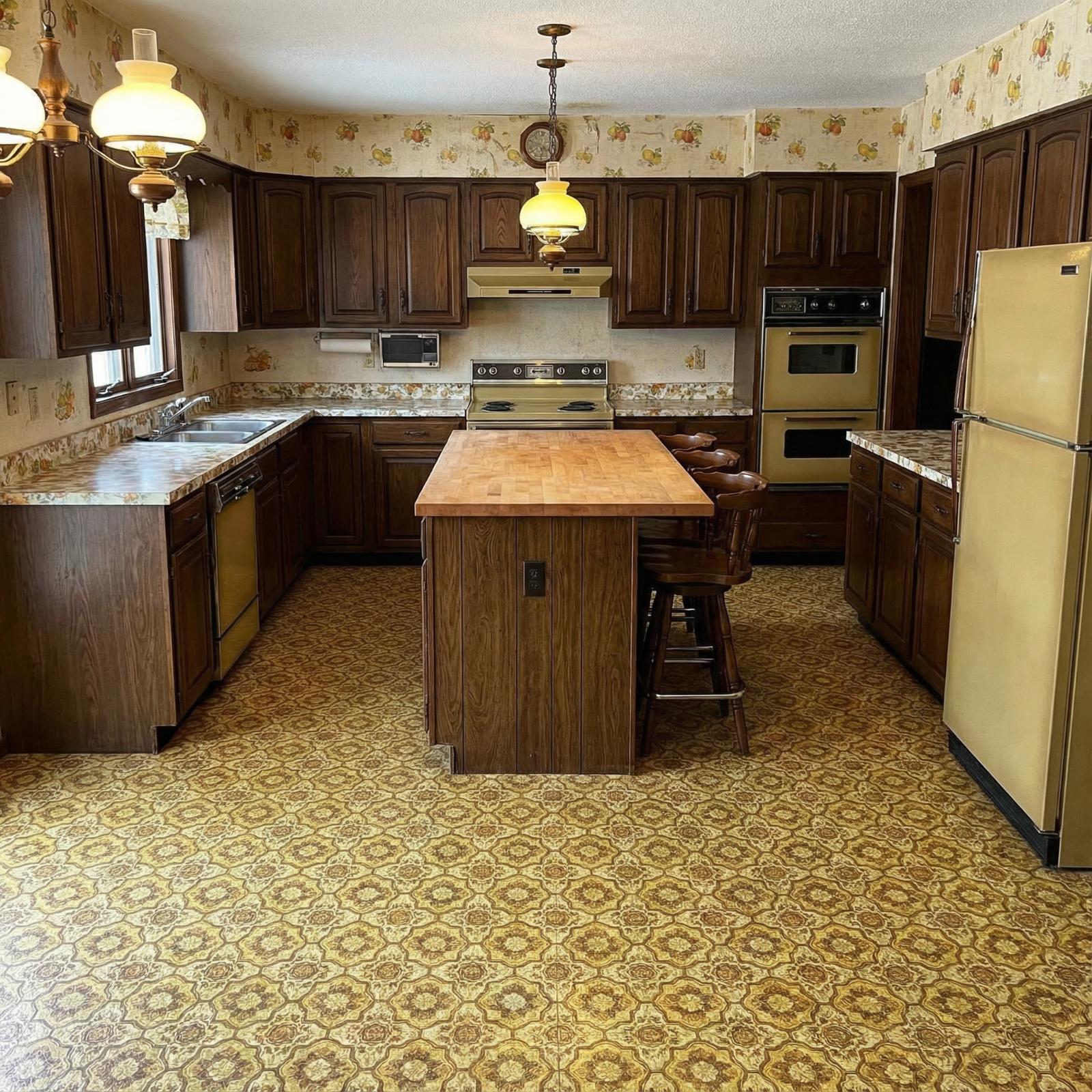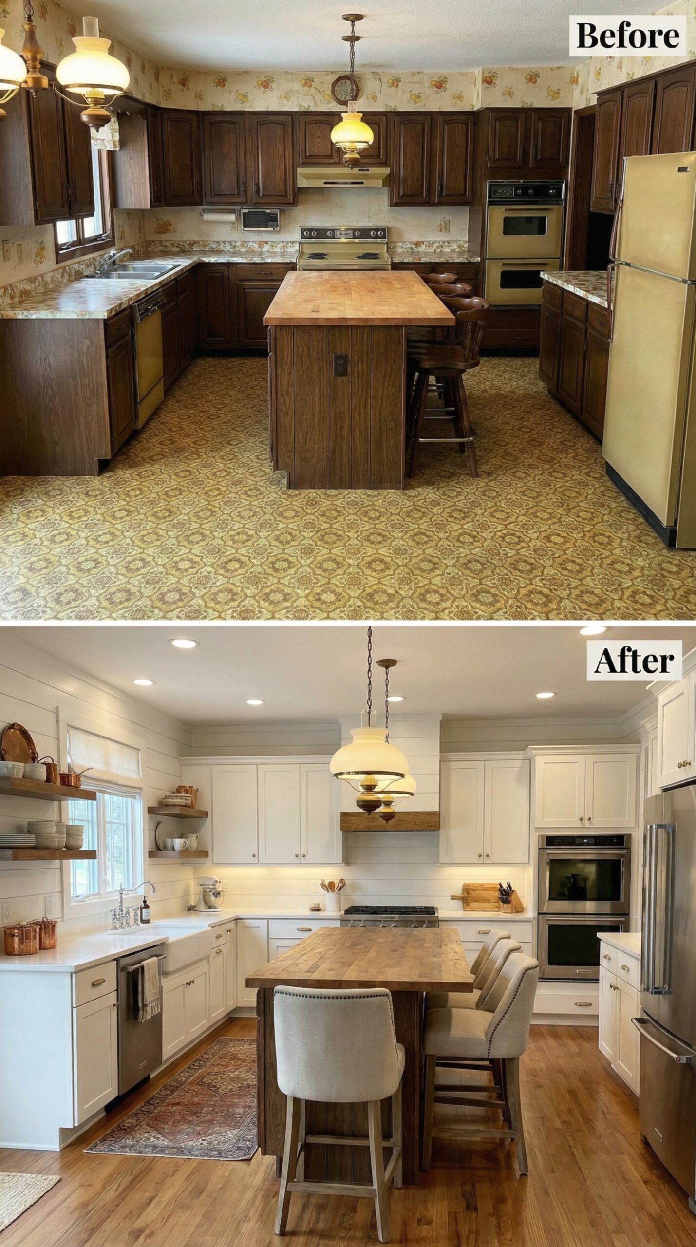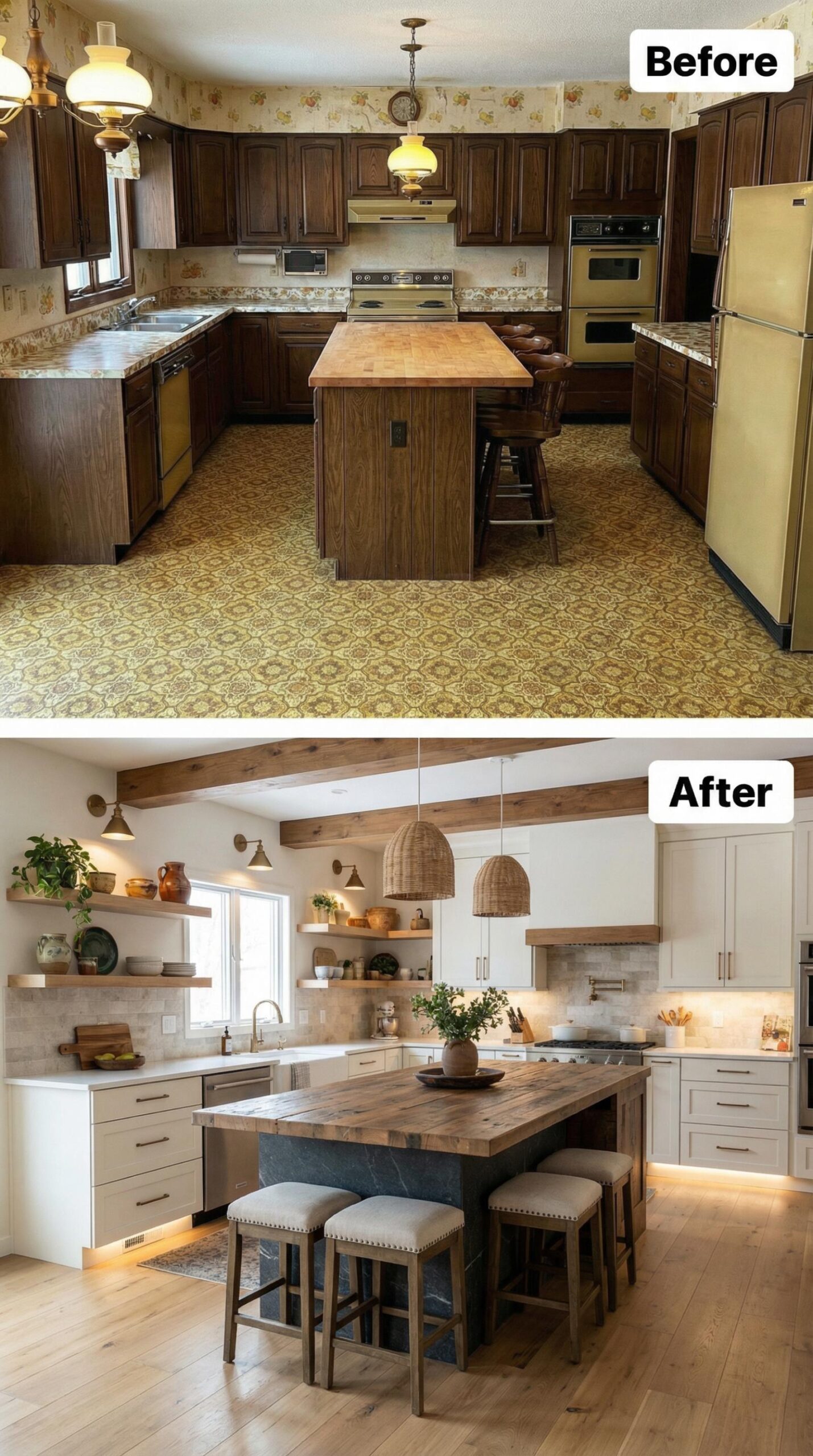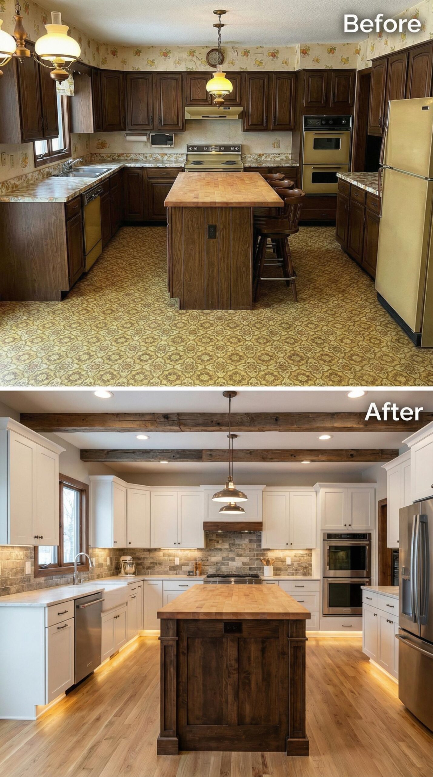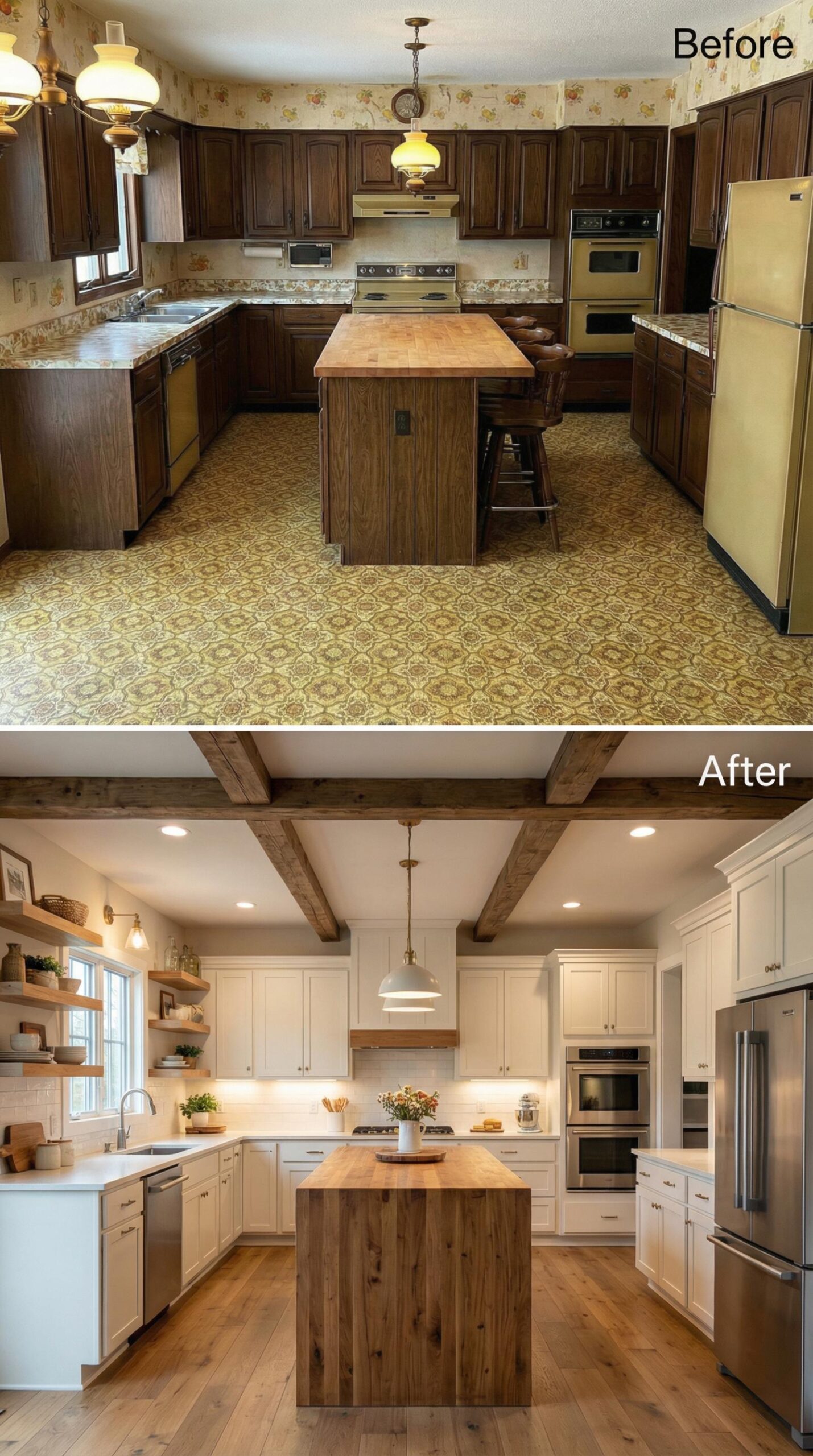 Dark wood cabinets and busy floral wallpaper gave way to crisp white cabinetry and exposed ceiling beams in this stunning transformation. Natural wood flooring replaces patterned linoleum while recessed lighting brightens every corner. Open shelving displays dishware beautifully, and the butcher block island anchors the space with warmth. Stainless steel appliances and clean subway tile create a timeless backdrop for family gatherings.