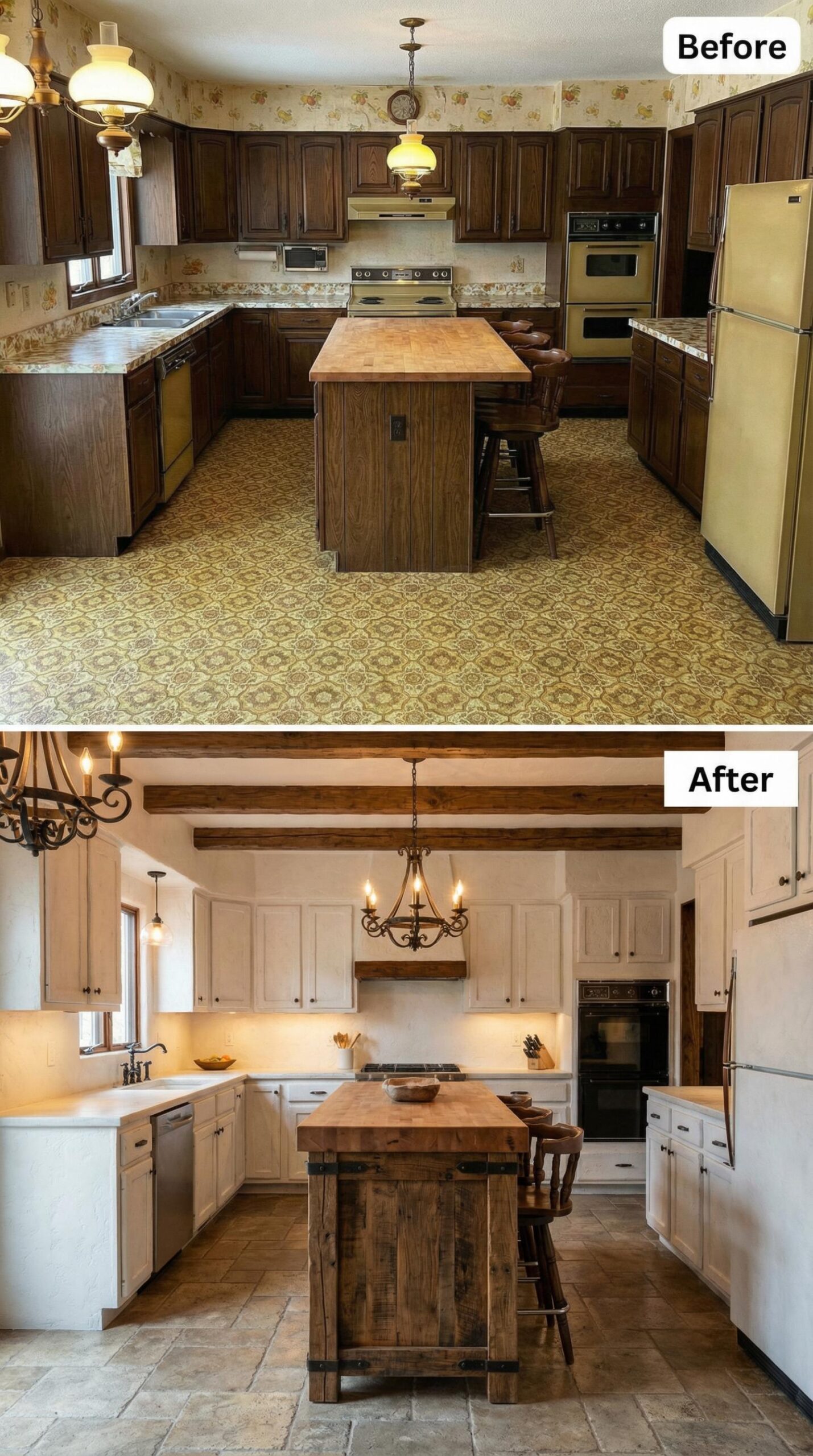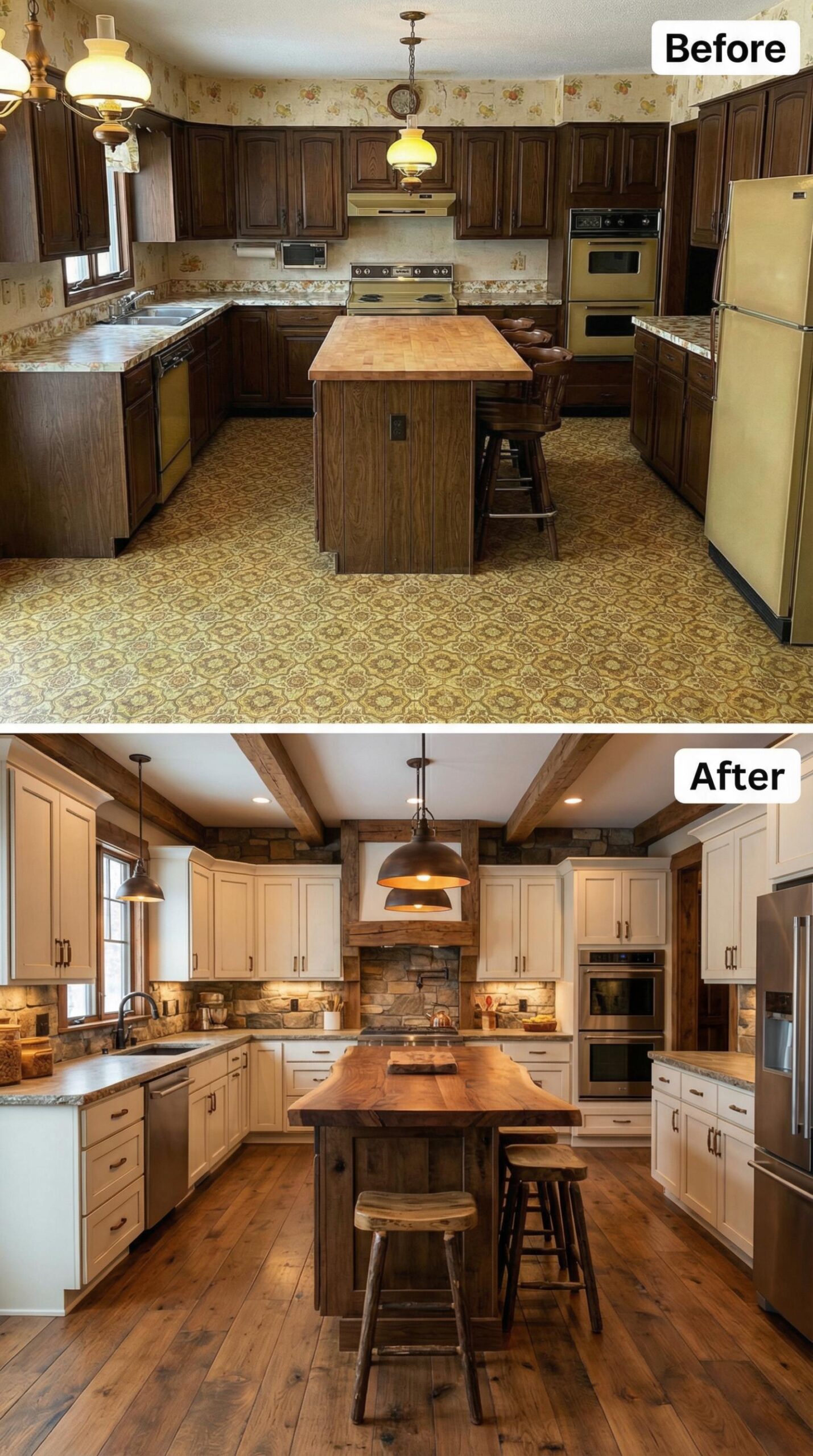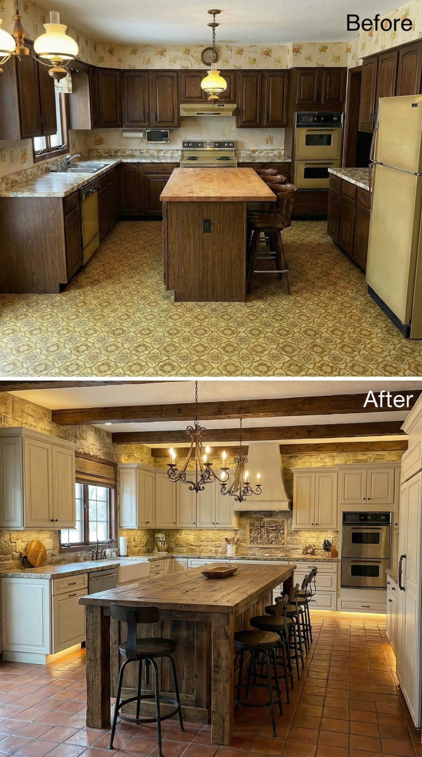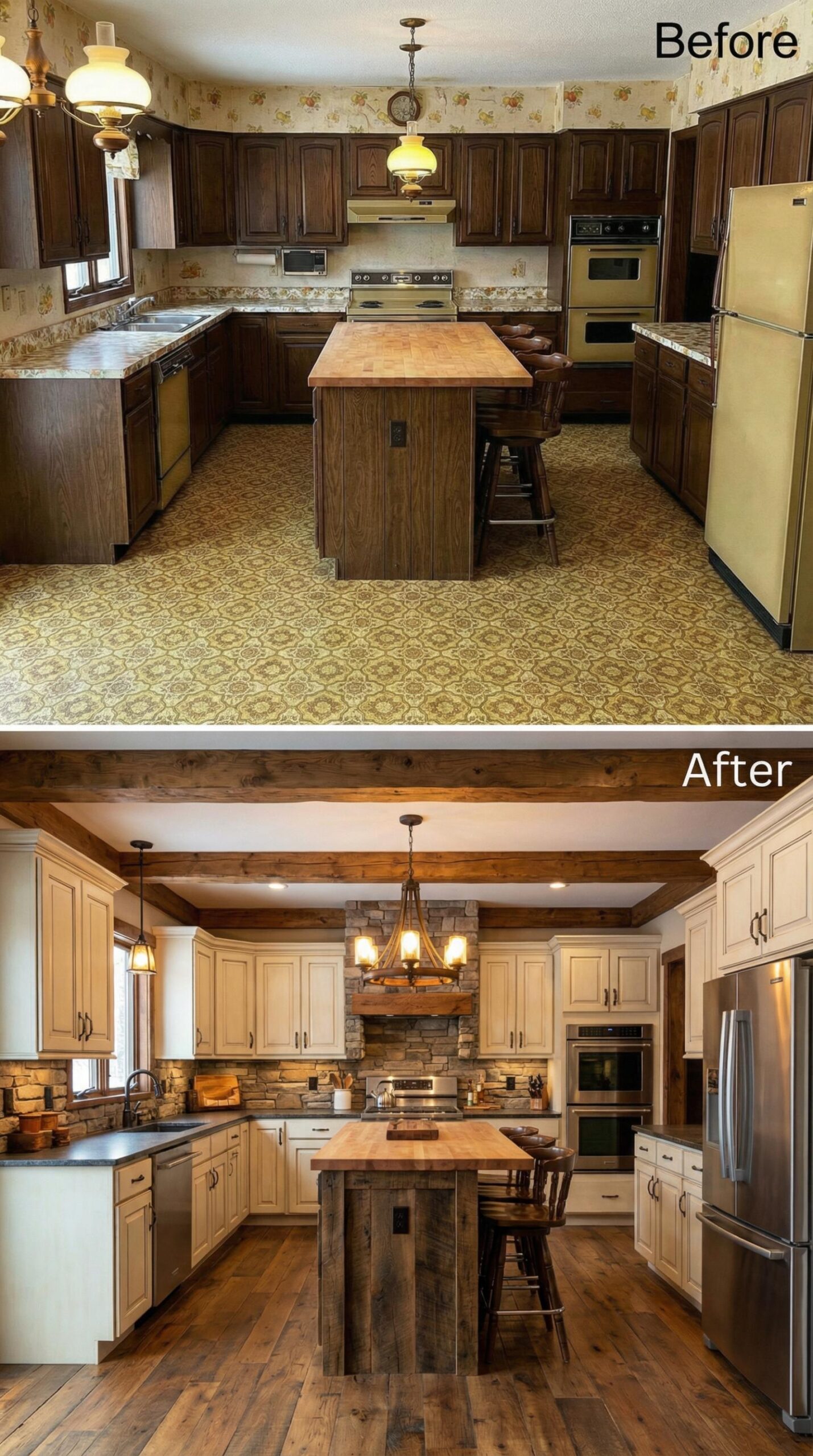 Warm cream cabinets replace dark brown ones while exposed ceiling beams add architectural drama to this stunning renovation. Natural stone backsplash creates texture against smooth countertops, and rich hardwood flooring grounds the lighter palette. Bronze pendant lighting and rustic bar stools complete the farmhouse aesthetic, proving how strategic updates transform outdated kitchens into inviting gathering spaces.
