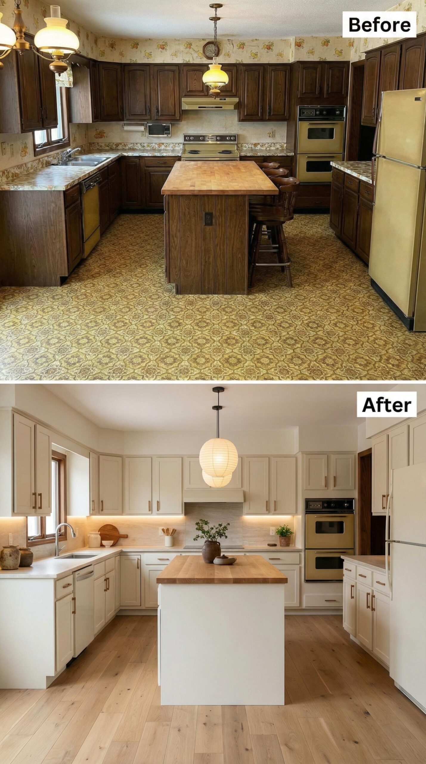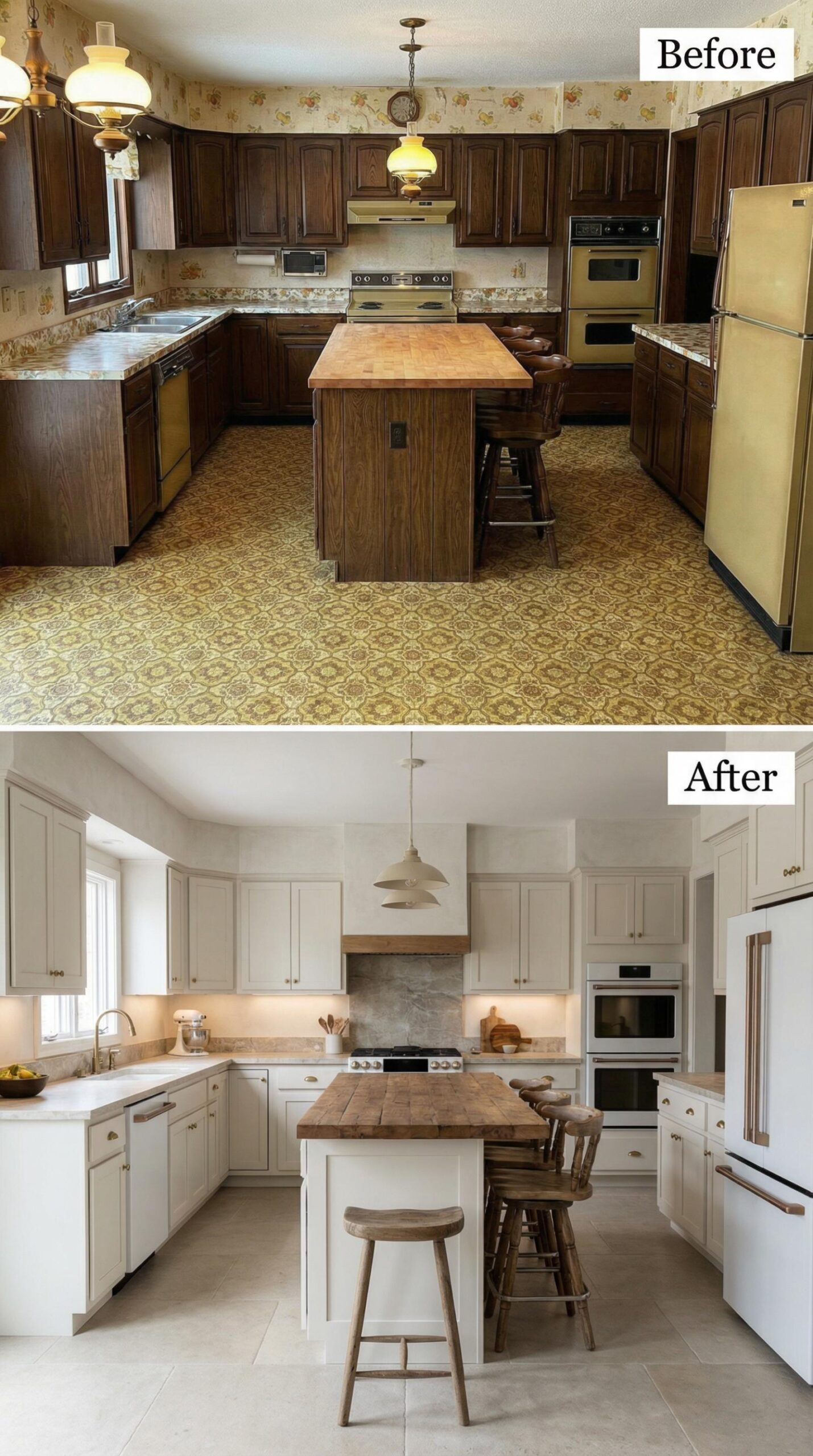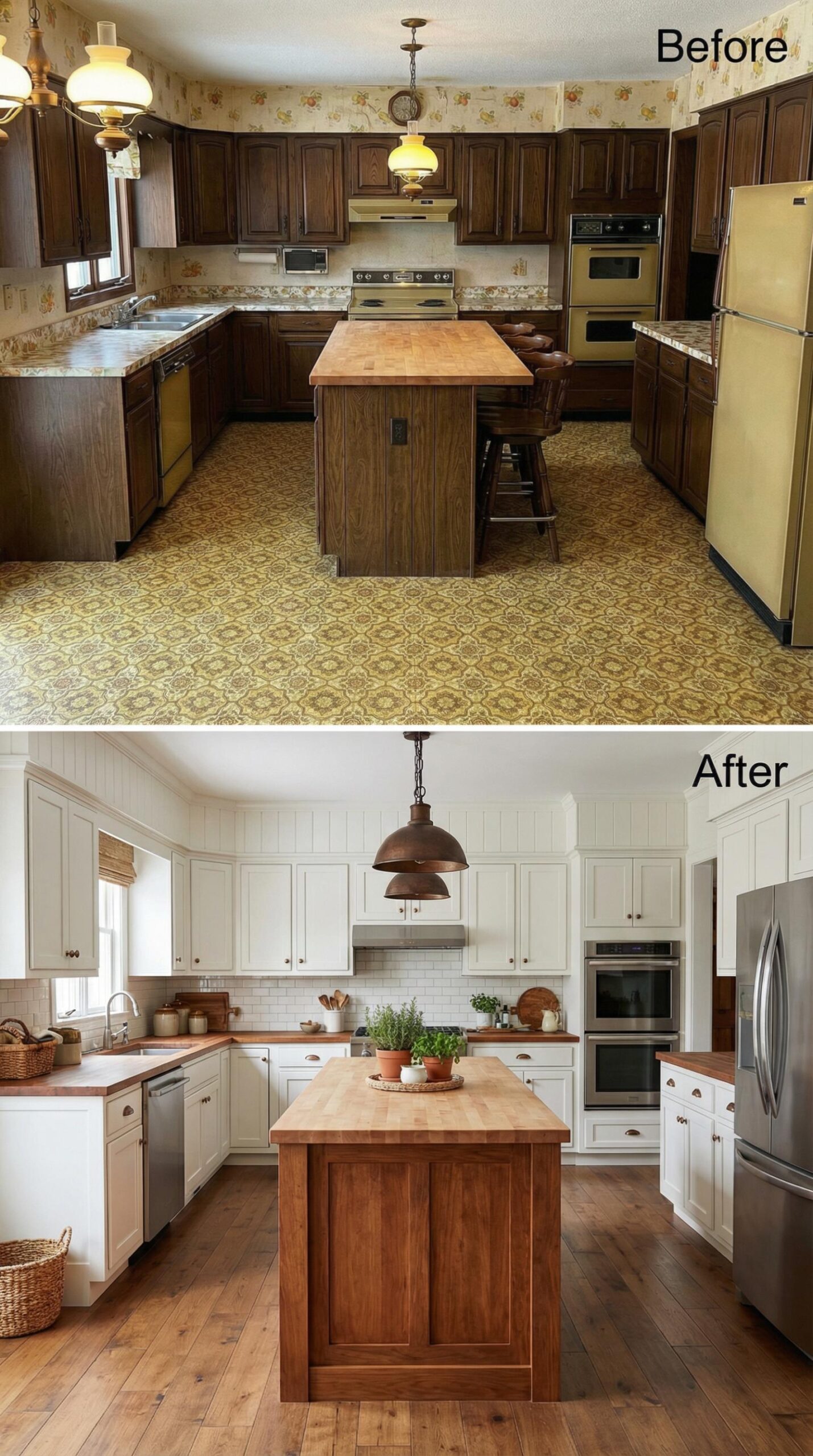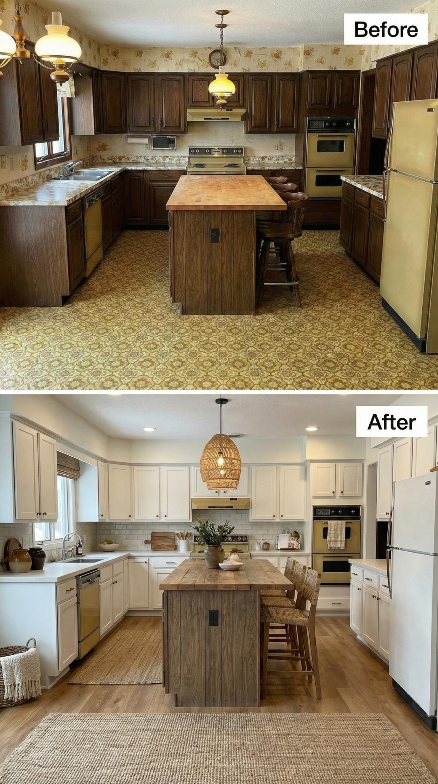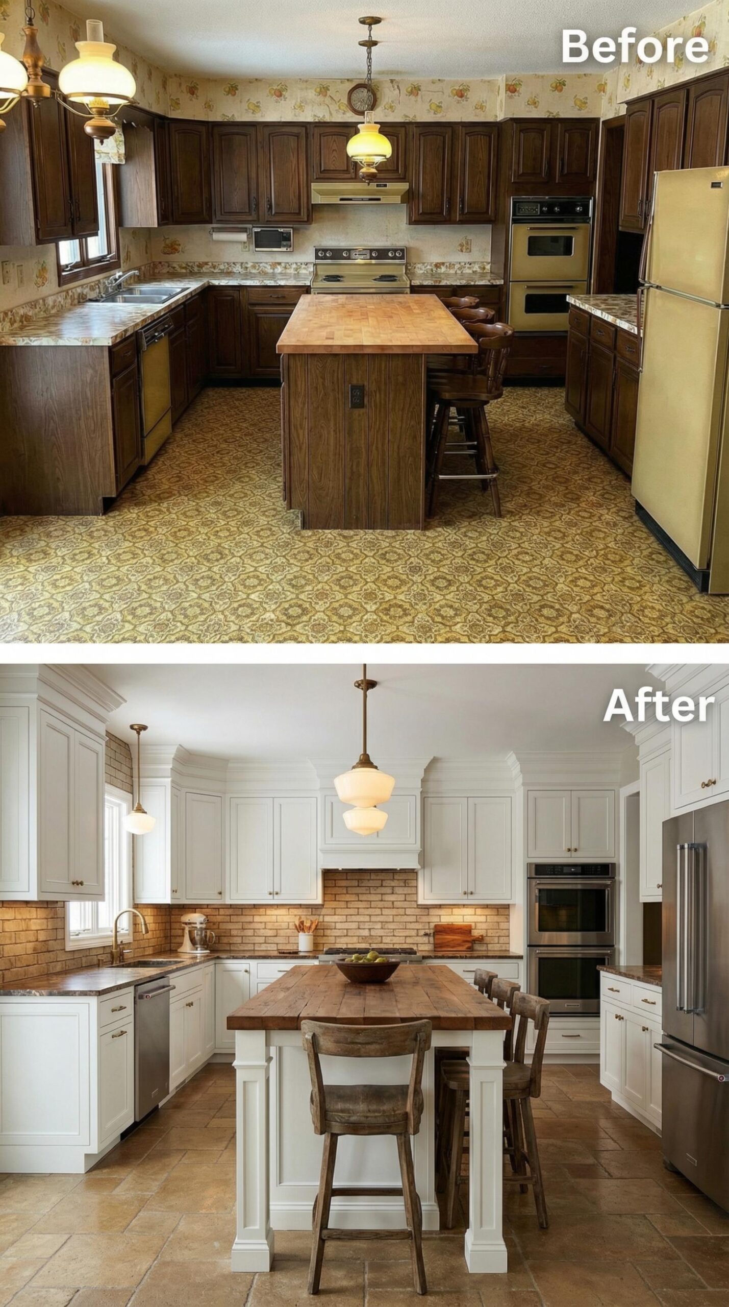 White shaker cabinets completely revolutionize this kitchen’s personality, replacing heavy brown wood with fresh, timeless appeal. Butcher block countertops warm the crisp palette while subway tile backsplash adds classic texture. Industrial bronze pendant lights create dramatic focal points above the central island. Natural wood flooring grounds the space with organic warmth, proving that strategic color changes can modernize any kitchen without sacrificing character.