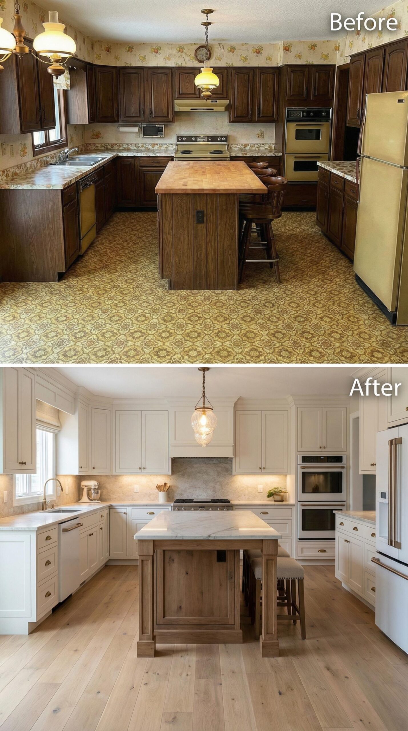 Dark wood cabinets give way to crisp white shaker-style cabinetry, instantly brightening the entire space. Natural wood flooring replaces busy patterned linoleum, creating a seamless foundation that grounds the design. White marble countertops and a matching backsplash elevate the kitchen’s sophistication, while under-cabinet lighting adds warmth and functionality for food preparation.