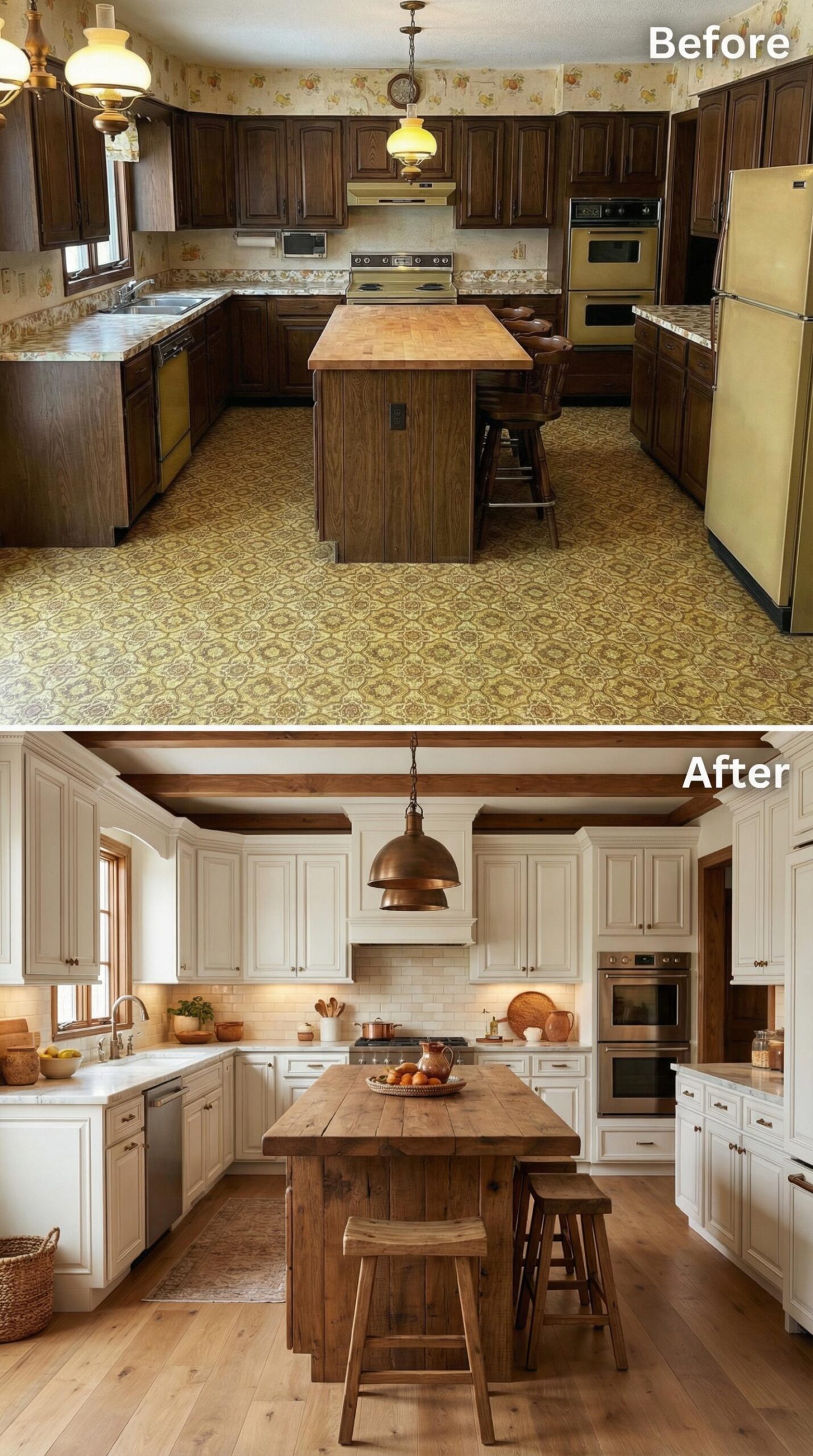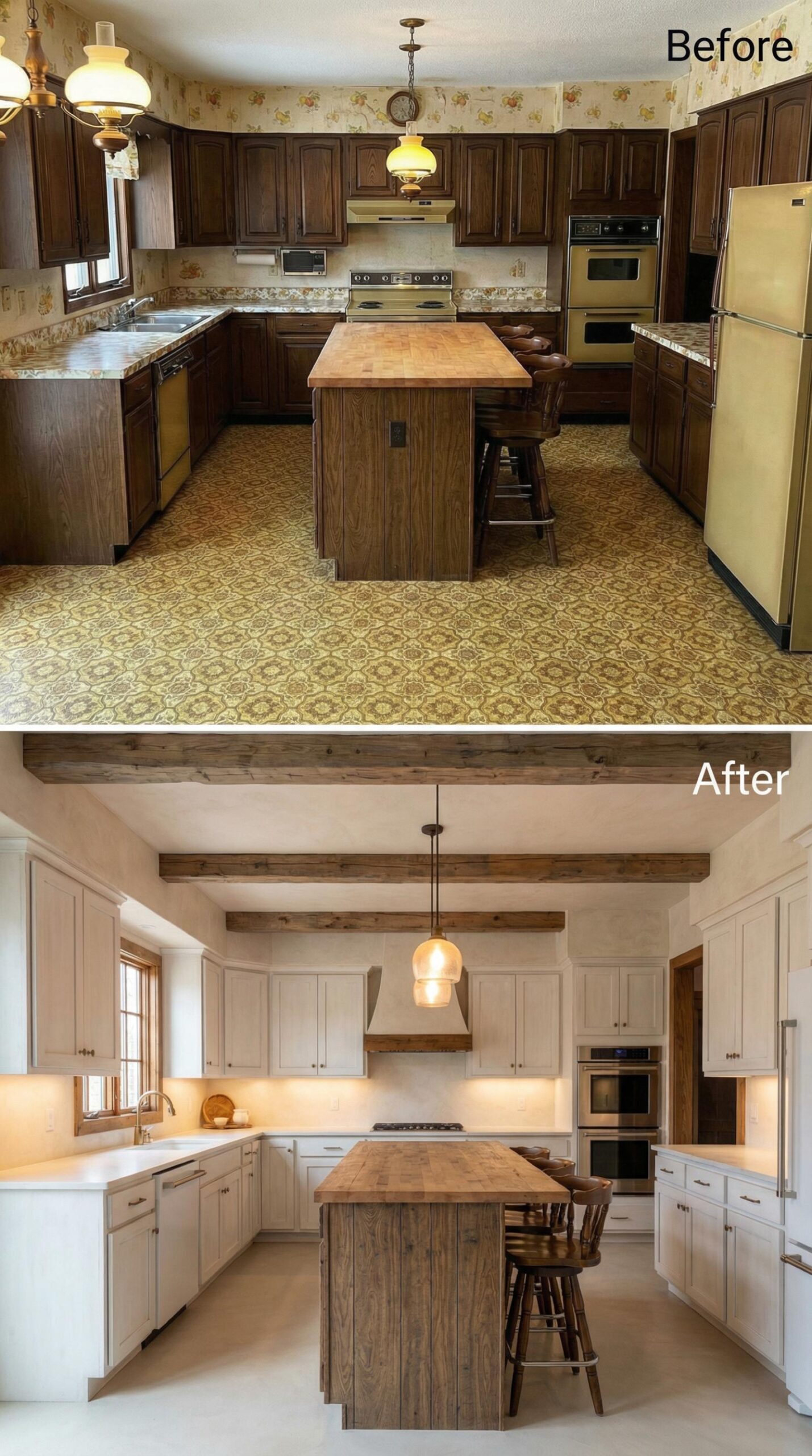 White shaker cabinets replace dark wood cabinetry while exposed wooden ceiling beams add architectural drama to this transformed space. The original island receives a rustic reclaimed wood makeover, creating a stunning contrast against crisp white countertops. Warm hardwood flooring and industrial pendant lighting complete the modern farmhouse aesthetic, proving how strategic updates can breathe new life into outdated kitchens.
