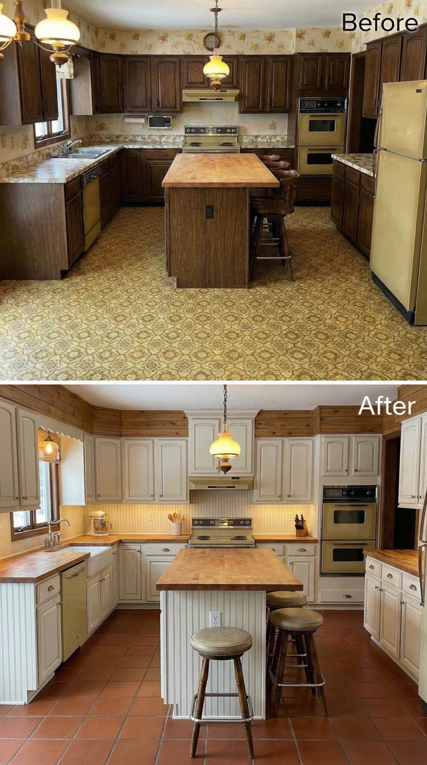 Bold cabinet painting transforms this outdated kitchen into a bright, welcoming space perfect for family gatherings. Warm cream cabinets replace heavy dark wood while maintaining the original layout and functionality. Butcher block countertops add natural warmth against the lighter palette, creating beautiful contrast with the rich terracotta tile flooring. Under-cabinet lighting illuminates the beadboard backsplash, enhancing the cottage-inspired aesthetic throughout.