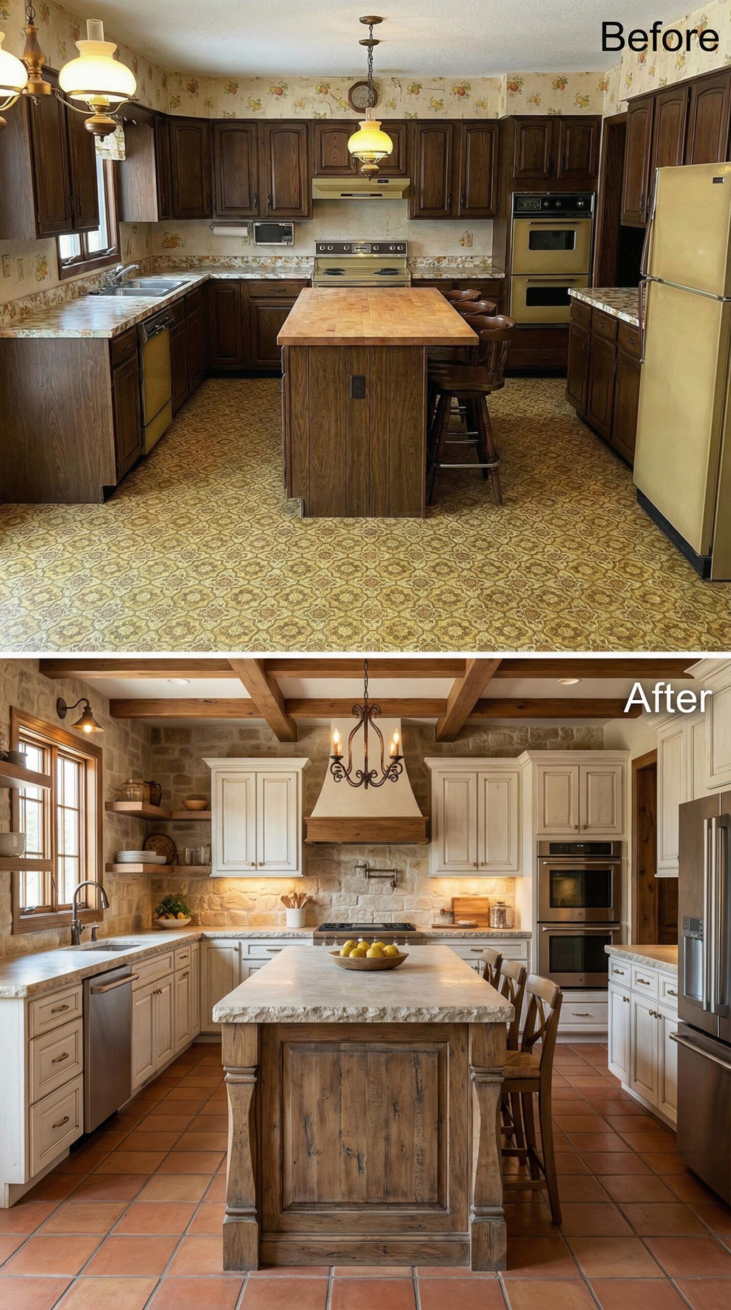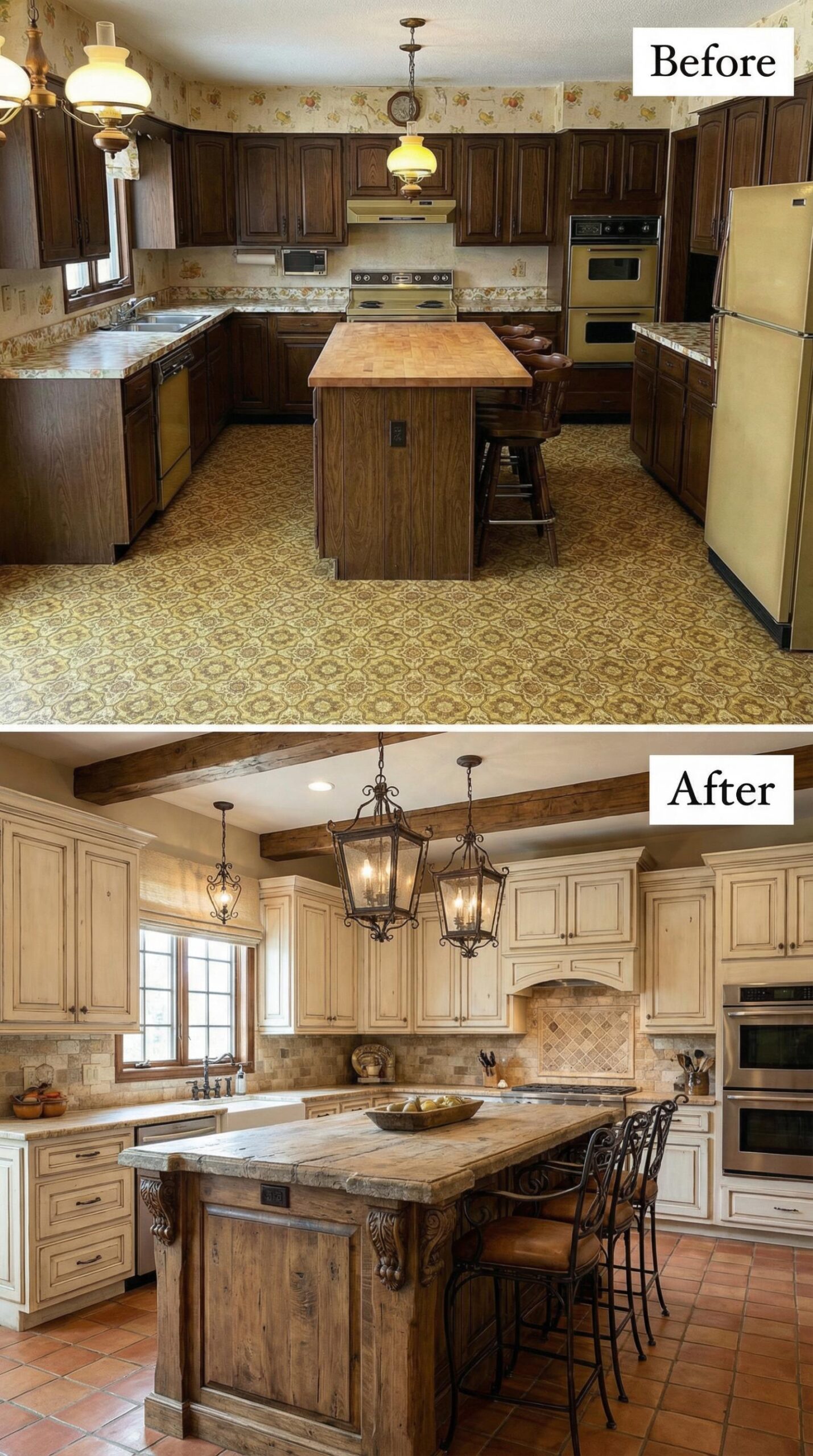 Dark wood cabinets give way to creamy painted cabinetry that radiates warmth and sophistication. Exposed wooden beams crown the space while lantern-style pendant lights cast an inviting glow over the expanded island. Terra cotta tile flooring and natural stone backsplash create textural depth, transforming a cramped galley layout into an open, breathable design that balances rustic charm with refined elegance.